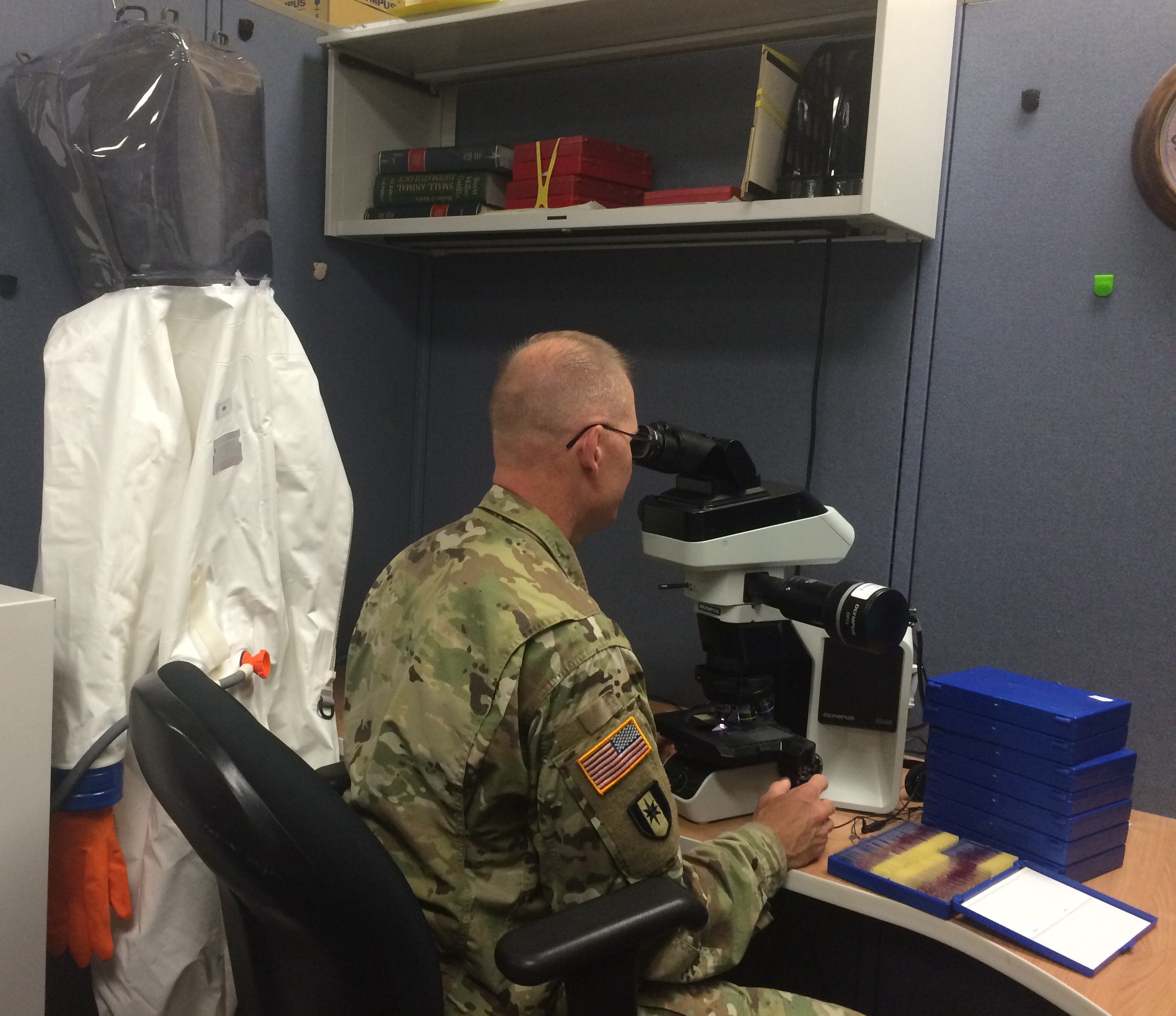USAMRIID pathologist reading histologic slides