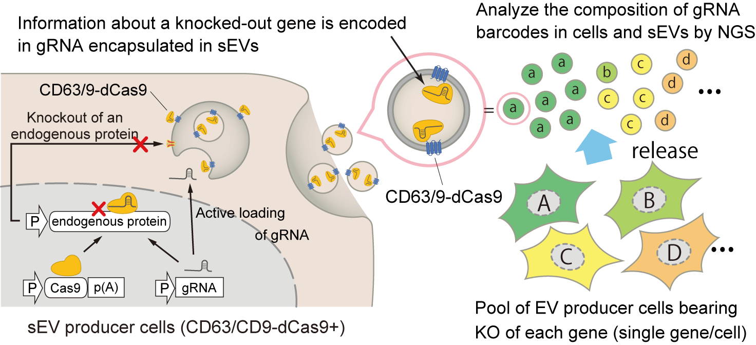 Our initial strategy was recruiting gRNA bearing a MS2 loop, an RNA motif that binds to its partner protein MS2 coat protein (MCP), into sEVs by using its interaction with MCP fused with a sEV marker CD63 (CD63-MCP) because gRNAs bearing MS2 loops had been already used for CRISPR activation screening [2]. The first hurdle was to develop a protocol to amplify gRNA for NGS readout. At the time, no researcher had tried sequencing transcribed gRNA, and we found that this is not easy without optimization because the spacer sequence of the Cas9 gRNA is located at the 5’ end and normal PCR cannot be applied. We found that the incorporation of SMART-Seq2 technology [3] would be a good solution for this, and we continued optimizing the protocol. However, even after making significant improvements to the protocol, we realized that the barcoding efficiency by CD63-MCP and MS2-gRNA never reached a sufficient level (40% of gRNA was found to be missing) in our settings, and also the distribution of barcode coverage in sEVs was highly skewed. The breakthrough here was that we came up with the idea to use dead Cas9 (dCas9) as the gRNA-recruiting protein instead of MCP. With this system, we succeeded in routinely getting rich coverage of gRNA (approximately 99%) displaying low skewness. It was gratifying that the necessary cell culture scale for getting such barcoding efficacy was not much different from that of normal CRISPR screening. Another merit of this system is that we can use a normal gRNA scaffold, allowing for the use of commercially available gRNA libraries without modification.