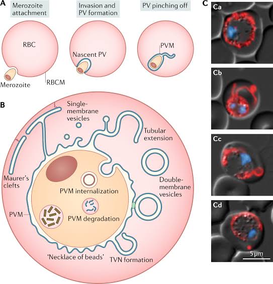 After hepatocyte invasion, Plasmodium sporozoites reside within the parasitophorous vacuole (PV), a membrane-bound compartment derived from the host plasma membrane but extensively modified by the parasite. The parasitophorous vacuole membrane (PVM) serves as the boundary between the host cytosol and the parasite’s replicative niche. It plays a vital role in regulating nutrient exchange, protecting the parasite from immune responses, and coordinating protein export (Mueller et al., 2005; Tarun et al., 2008).