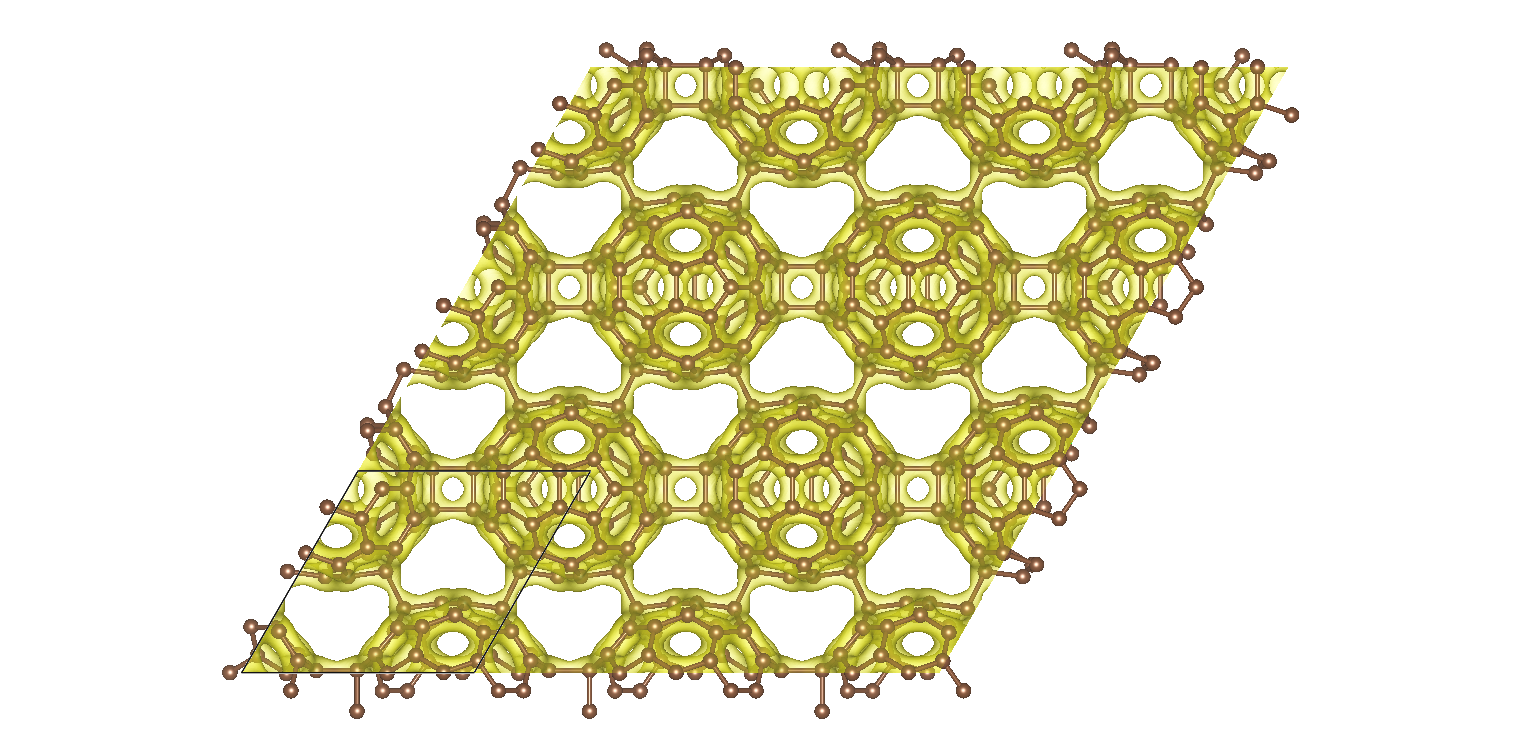 Fig. 1 Two-dimensional projection of the atomic structure of graphullerene together with a high electron density iso-surface. The black lines indicate a primitive unit cell.