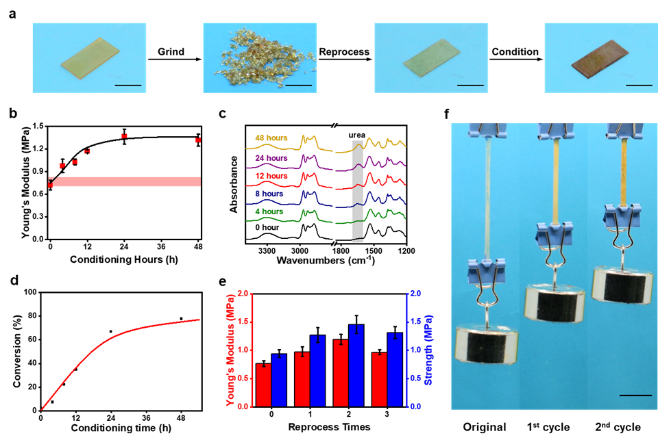 Fig. 3 | Network reprocessing and enhancement in mechanical properties. a, Photographic images of the sample at different stages during the reprocessing. b, Change in Young’s modulus of the reprocessed samples with different conditioning time in air. c, FTIR change of the reprocessed samples with different conditioning time (in air) d, Hindered thiourea conversion of the reprocessed samples with different conditioning time. e, Change in Young’s modulus and strength at different reprocessing cycles. For each reprocessing cycle, the conditioning time is 4 h. f, Photographic images of the thiourea sample with different reprocessing cycles under a constant load of 50 g. The sample size without the external load is 15×3×0.5 mm. All scale bars are 1 cm.