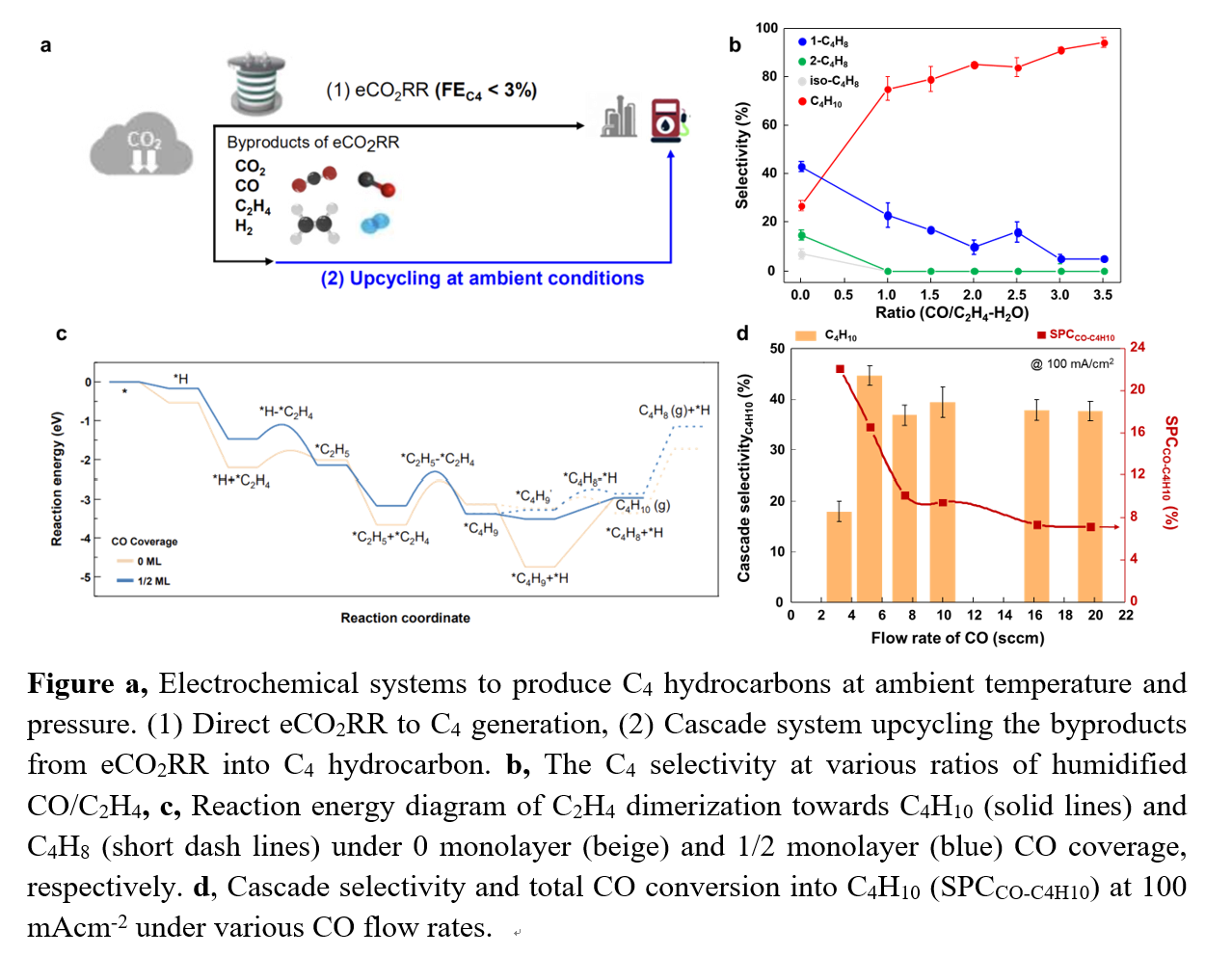 We sought instead a way to selectively produce C4 hydrocarbon under ambient conditions. We pursued the coupled CO2/CO electrolysis with C2H4 dimerization to produce C4 hydrocarbons with high selectivity and C2H4 conversion efficiency under ambient conditions. A direct feed between reactors enabled to reduce separation costs in the system.