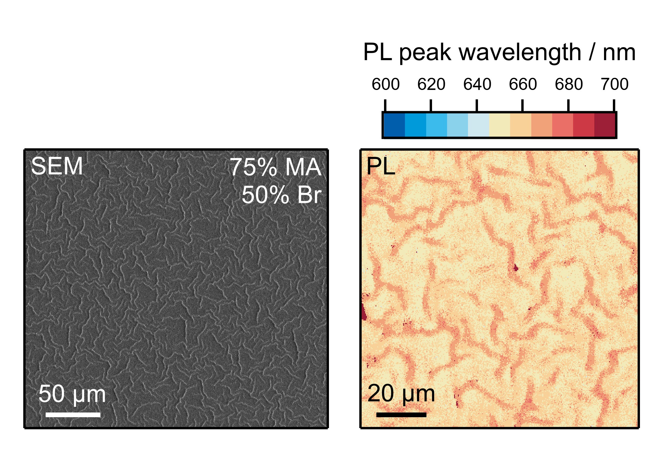 Fig. 1 | Top-view scanning electron microscopy image (left) and hyperspectral photoluminescence map (right) of FA0.25MA0.75Pb(I0.50Br0.50)3 perovskite film