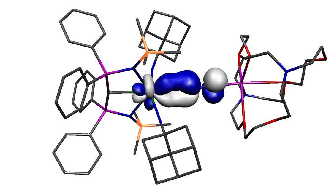 The molecule reported in our study is therefore one of those molecules that should not exist because in addition to the aforementioned arguments the computed back-bond, shown above (with hydrogen atoms omitted from the model), involves a uranium 5f-orbital, which in the Periodic Table is not exactly one of the most expansive orbitals with which to overlap with ligands. So the odds are completely stacked against this molecule ever forming, yet we can routinely access it now we know it can be made – so how can this be?