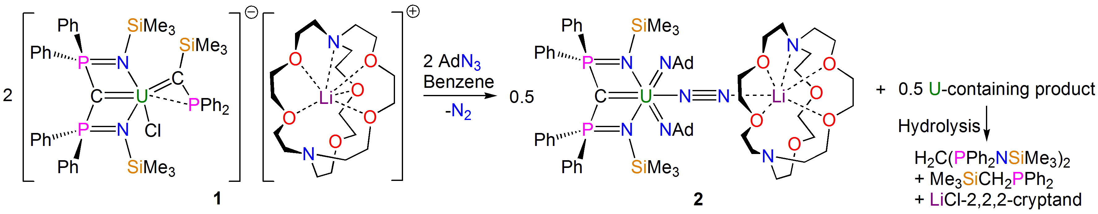 In a recent paper in Nature Chemistry, we describe one such situation resulting from the reaction shown in the scheme above, where an electron poor, high oxidation state 5f1 uranium(V) ion is bonded to dinitrogen, ostensibly one of the worst ligands a metal can bind to, and there is no way anyone would ever have predicted that product.
