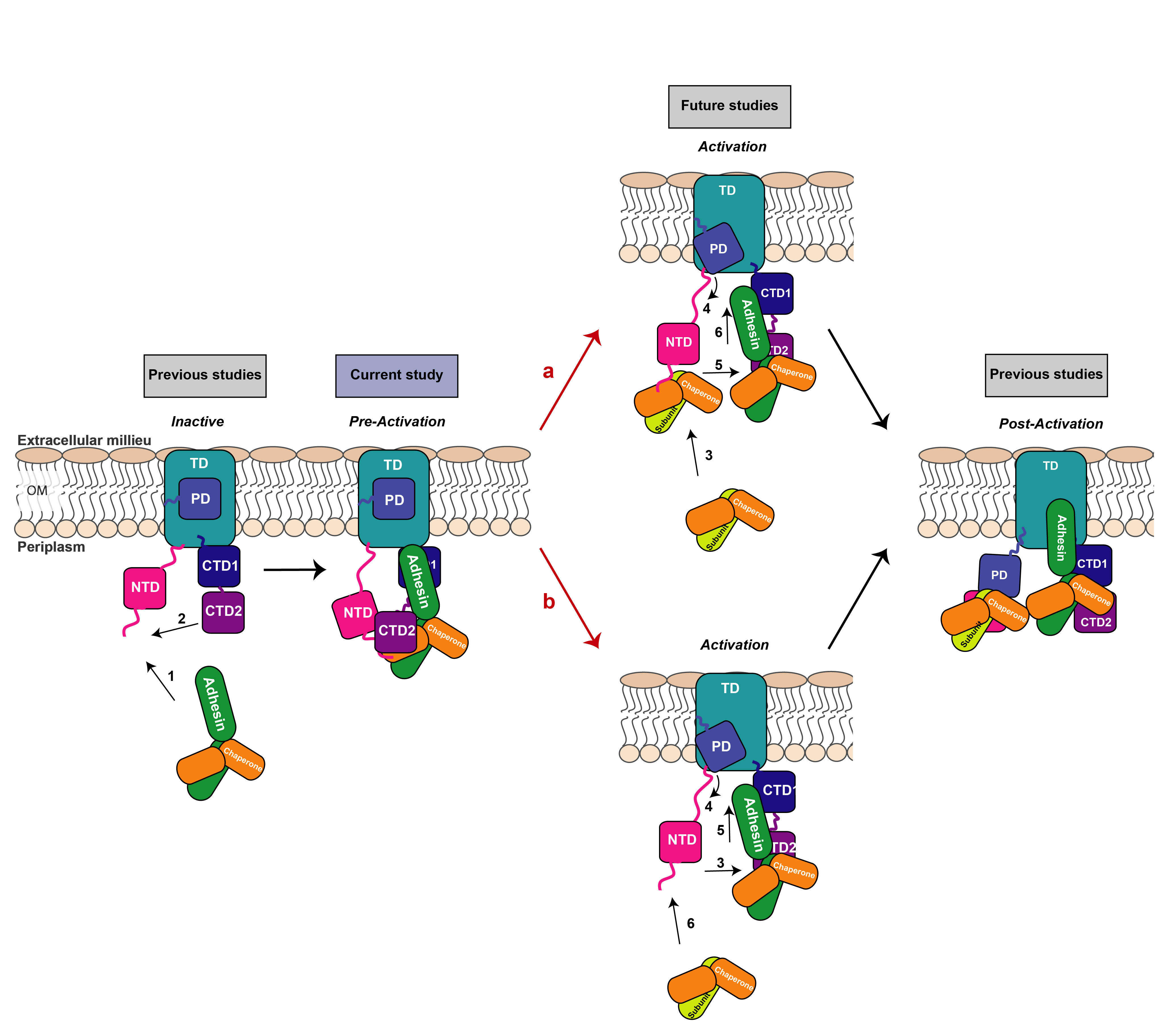 Activation of the usher to initiate the pilus assembly cascade is a complex multi-step mechanism, which begins with the interactions between the chaperone-adhesin and usher NTD and results in: i) chaperone-adhesin association with the NTD in the periplasm; ii) transfer of chaperone-adhesin from the NTD to CTDs; and iii) plug domain displacement, thereby priming the usher to coordinate pilus assembly at the outer membrane. In the P pilus system, efficient activation of the PapC usher is thought to occur when the PapDG chaperone-adhesin complex binds to the usher NTD followed by binding of the PapDF chaperone-pilin complex. However, the mechanism by which activation leads to the transfer of the PapDG complex from the NTD to the CTD and the movement of the plug domain out of the TD channel to catalyze pilus assembly has been heretofore uncharacterized.