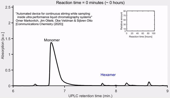 Our lab has been studying a special kind of dynamical combinatorial chemistry – a kind that gives rise to exponential replication through self-assembly under agitation [Science (2010)]. Starting from a dithiol-benzene functionalized building block (“monomer”), a dynamical phase occurs with the appearance of several cyclic oligomers that are dynamically interconverting via reversible disulfide exchange reactions. Eventually, a particular oligomer often exhibits exponential growth and overtakes in the system, in a replication-like process [Science (2010) ; J. Am. Chem. Soc. (2013)]. Importantly, this self-replication is enabled by the ability of the oligomer to self-assemble by stacking to form fibers, in a process that is catalyzed by fibers’ edges [Nat. Commun (2015)]. Under agitation such as stirring, those fibers break and expose more edges in the system therefore promoting the replication process. Given the dynamical nature of the system, an ultra-performance liquid chromatography (UPLC) system is often used for the analysis of the libraries. Laboratory stirring plates are commonly used for triggering the replication and homogenizing the samples.