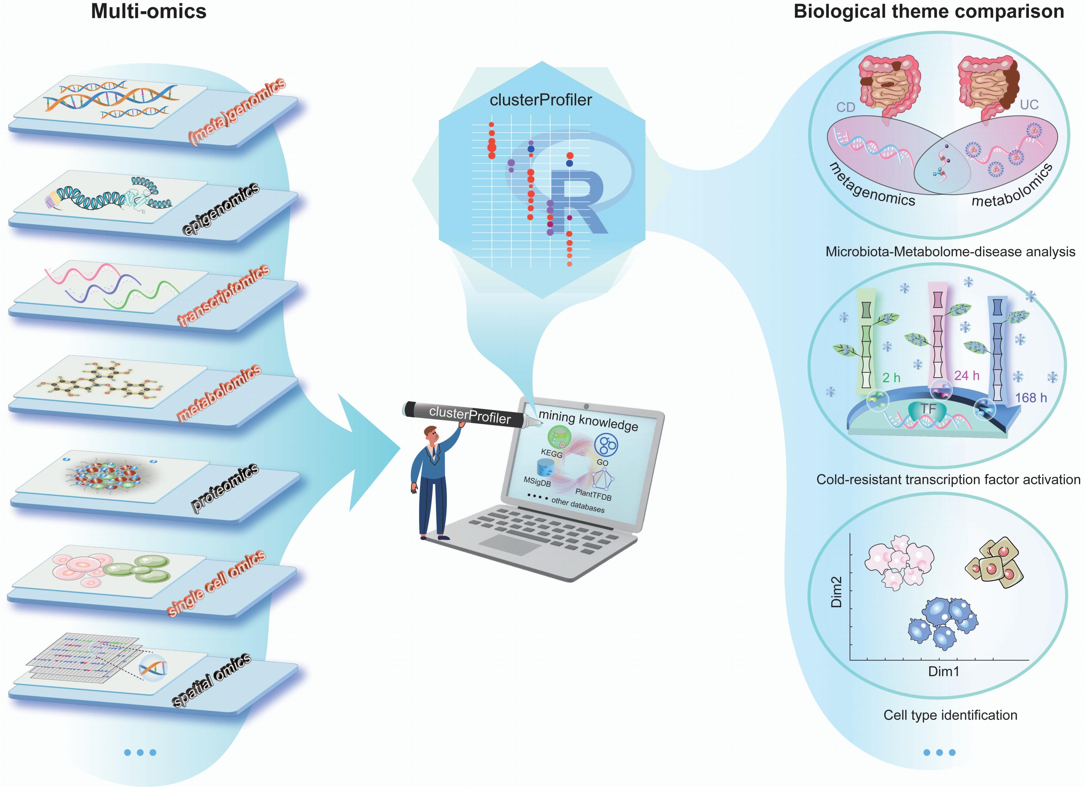 This protocol mainly introduces three user cases, demonstrating the functionality of comparing biological themes in disease subtypes, analyzing functions of perturbed transcription factors, and annotating cell types using various omics data sets, including metagenomics, metabolomics, transcriptomics, and single-cell omics.