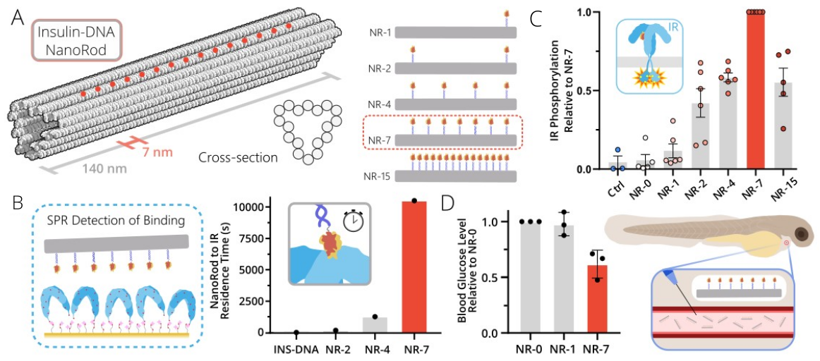 Fig. 1 | Multivalent insulin receptor activation using insulin-DNA origami nanostructures. A) A rod-like DNA origami was designed, allowing for the placement of insulin peptides at specific sites along the structure (red circles). B) Binding of the structures to the insulin receptor was investigated using SPR. Residence times of the structures to the insulin-receptor-coated surface increased with increasing numbers of insulin attached. C) Activation of the insulin receptor was determined via western blot. The highest activation was seen with our seven-insulin-containing structure. D) The structures were injected into zebrafish larvae which had had their pancreatic beta-cells destroyed. Our seven-insulin structure was able to significantly decrease the free glucose levels in the fish.