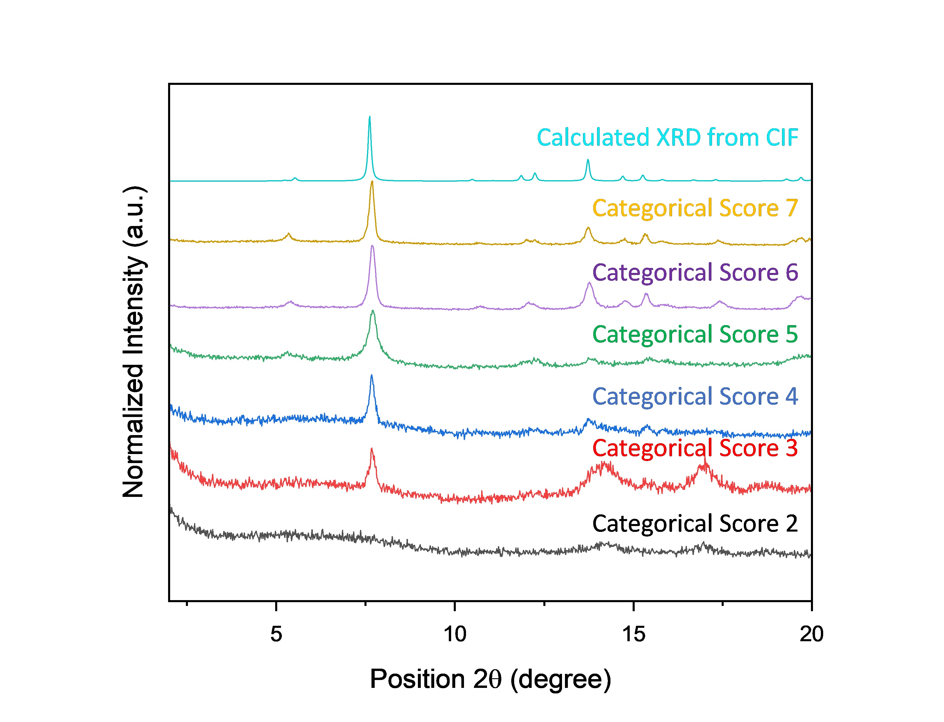 After we defined the importance of each variable and range in which we wanted them to vary, the SyCoFinder web application provided us with the first set of experimental synthesis conditions (1st generation). The samples from the 1st generation were synthesized, collected, and analyzed such that we would be able to answer the following questions: is this the MOF structure we are looking for? How crystalline is it? These were addressed via powder X-ray diffraction (PXRD). Throughout the first set of experiments, we could observe a significant discrepancy in the results. Some reactions did not yield any powder, others were amorphous, while the remaining ones were crystalline and matched the calculated PXRD from the CIF of Al-PMOF (Fig. 2).