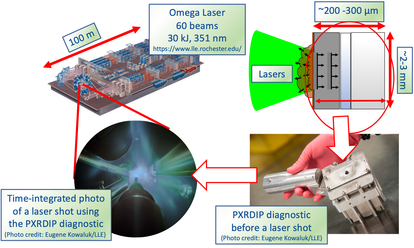 X-ray diffraction is one of the few experimental platforms at Omega where the PI is actually responsible for setting up the diagnostic for the shot. We use an instrument called PXRDIP (Powder X-Ray Diffraction Image Plate) [4], consisting of a 50x50x75 mm box containing x-ray sensitive detectors (Figure 1). To prepare the diagnostic for the experiment you first line the inside walls of the box with image plates detectors, add filters (if needed) and insert the sample in the front face where the lasers beams are focused. You then go back to the control room and wait for the 10 second count down announcing the upcoming laser blast.