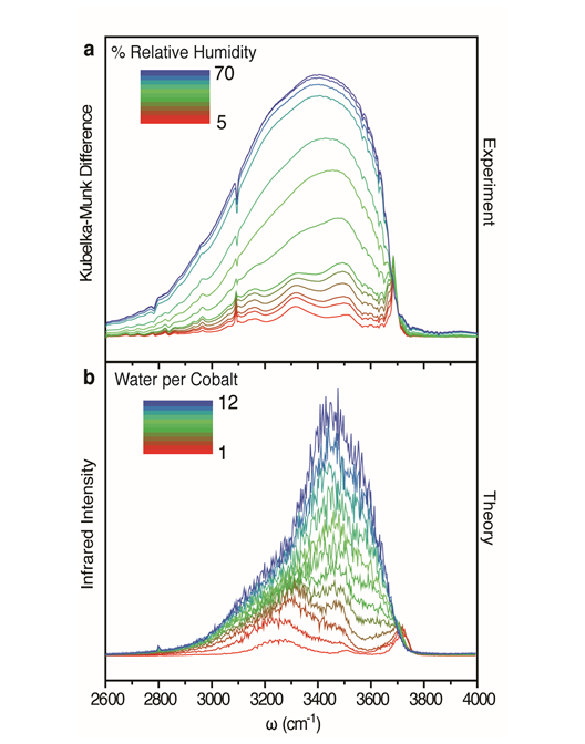 To begin investigating water confined in Co2Cl2BTDD, we calculated infrared (IR) spectra of water both in experiment and theory. The agreement we found was astounding. To our knowledge, this was the best agreement between experiment and theory for confined water. The frequencies of the peaks in the IR spectra agree very well with each other, providing validation for the structure of the hydrogen-bonding network of water in confinement.