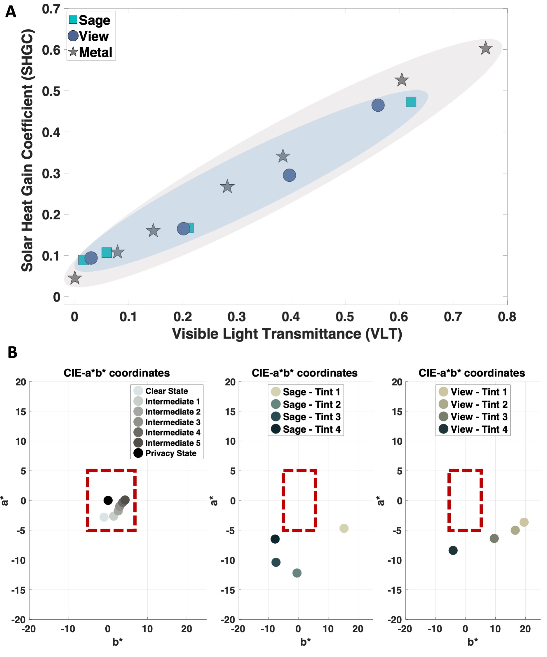 The use of metals in dynamic windows offers several important advantages over current state-of-the-art commercial technologies. Metals are the most conductive class of materials and exhibit strong interactions with light. The Bi-Cu films in our dynamic windows offer an intrinsic neutral color due to broad absorbance and reflectance over the visible spectrum compared to the sharp absorption features typical of electrochromic materials. The metal films reflect, rather than absorb, in the near-infrared (NIR) wavelengths which yields greater energy savings, especially in hot and sunny climates. And, the metal films completely block radiation over the entire solar spectrum after achieving ~100 nm thickness. The result is that RME dynamic windows exhibit an ultrawide optical range from clear glass (Tvis : 70%) to full blackout (Tvis: 0%) for maximal user control and comfort. In Figure 1, we compare the performance of RME windows to two state-of-the-art electrochromic technologies across the three most important metrics for windows: visible light transmittance (VLT), solar heat gain coefficient (SHGC), and color (a*,b*).