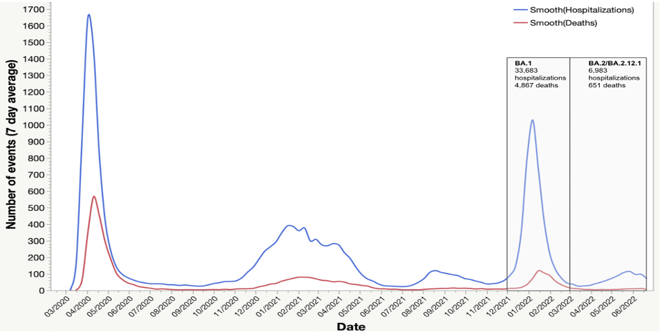 To better ascertain the severity of the BA.2/BA.2.12.1 sub-variant, we examined routinely collected data on hospitalizations and deaths. We found that while COVID-19 hospitalizations and deaths increased during the BA.2/BA.2.12.1 surge, the increase was modest when compared to the BA.1 surge (Figure 1). Our survey findings of the high prevalence of hybrid immunity among those who were infected likely explain the lower rates of hospitalizations and deaths in NYC during this surge.
