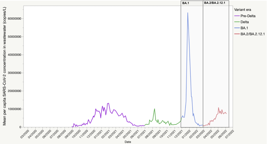 We also examined the signal of SARS-CoV-2 concentration per capita in NYC wastewater surveillance data during the BA.2 surge which was modest in comparison to that during the BA.1. surge (Figure 2). This finding prompted us to hypothesize whether this modest peak could reflect lower mean peak viral load per infection due to greater acquired T-cell mediated immunity from recent prior BA.1 infection4, which infected large swaths of NYC adults in late 2021 early 20225. If this were true, re-infections may reduce the magnitude of peak SARS-CoV-2 concentration in wastewater, even for roughly the same number of individuals in the population with active SARS-CoV-2 infection.