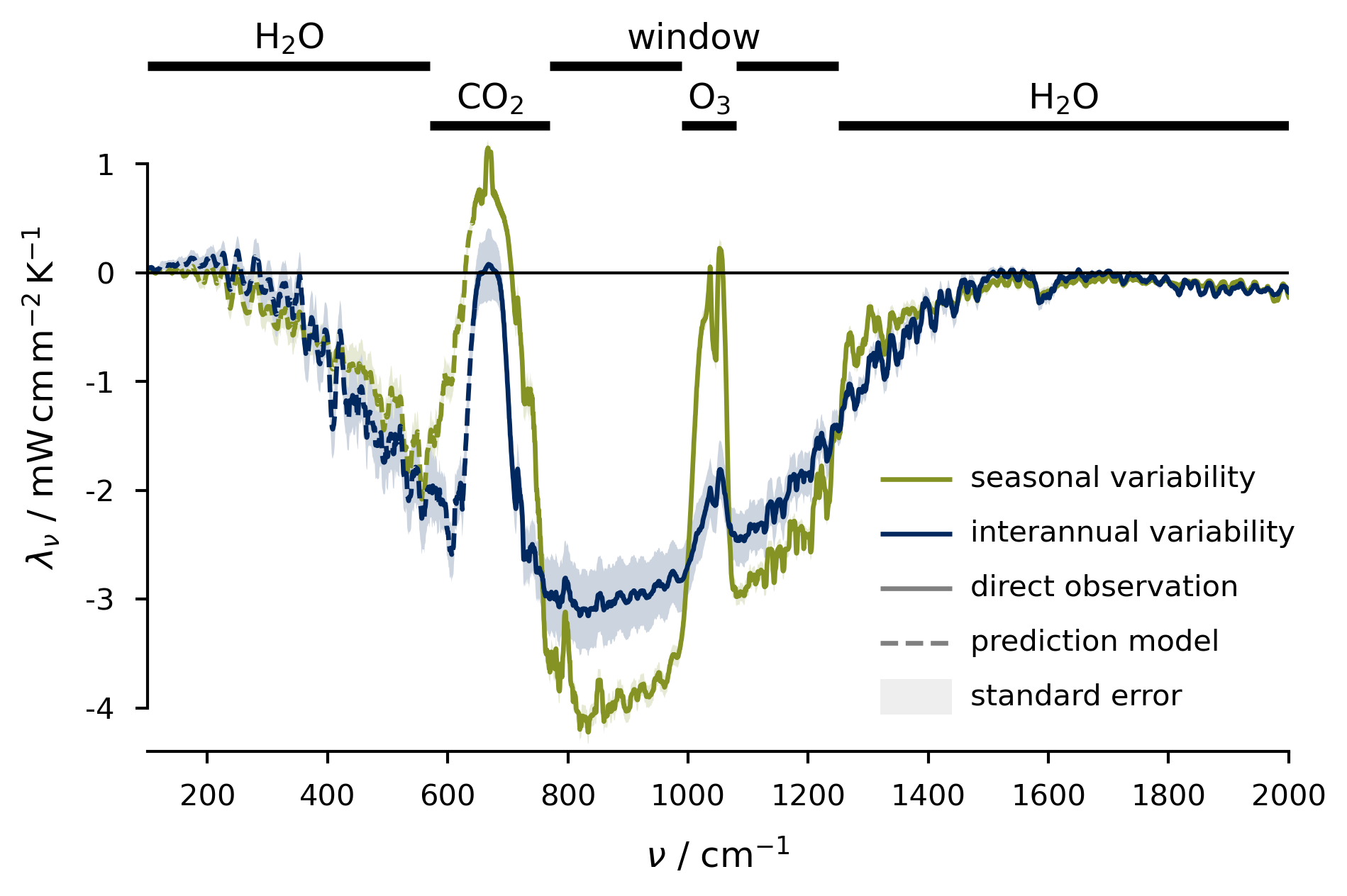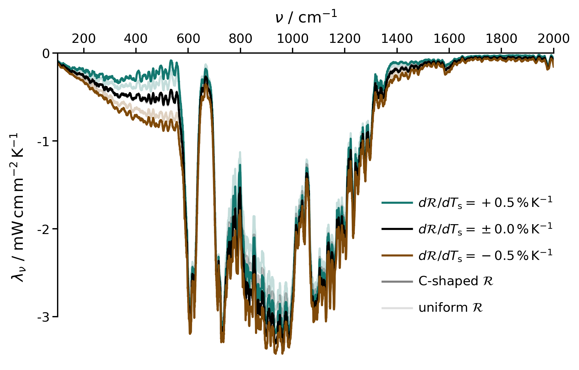 Luckily, the infrared radiation Earth emits can be directly observed by satellites orbiting Earth. In our study, we use satellite observations by the so-called IASI instrument which measures the outoing radiation at more than 8,000 different wavelengths and analyse how the radiation Earth emits has changed with the temperature of Earth's surface between 2007 and 2020. We find that the emitted infrared radiation seems to increase in both the window and the water vapour bands, i.e., the spectral longwave feedback parameter is negative throughout the spectrum (Figure 1).