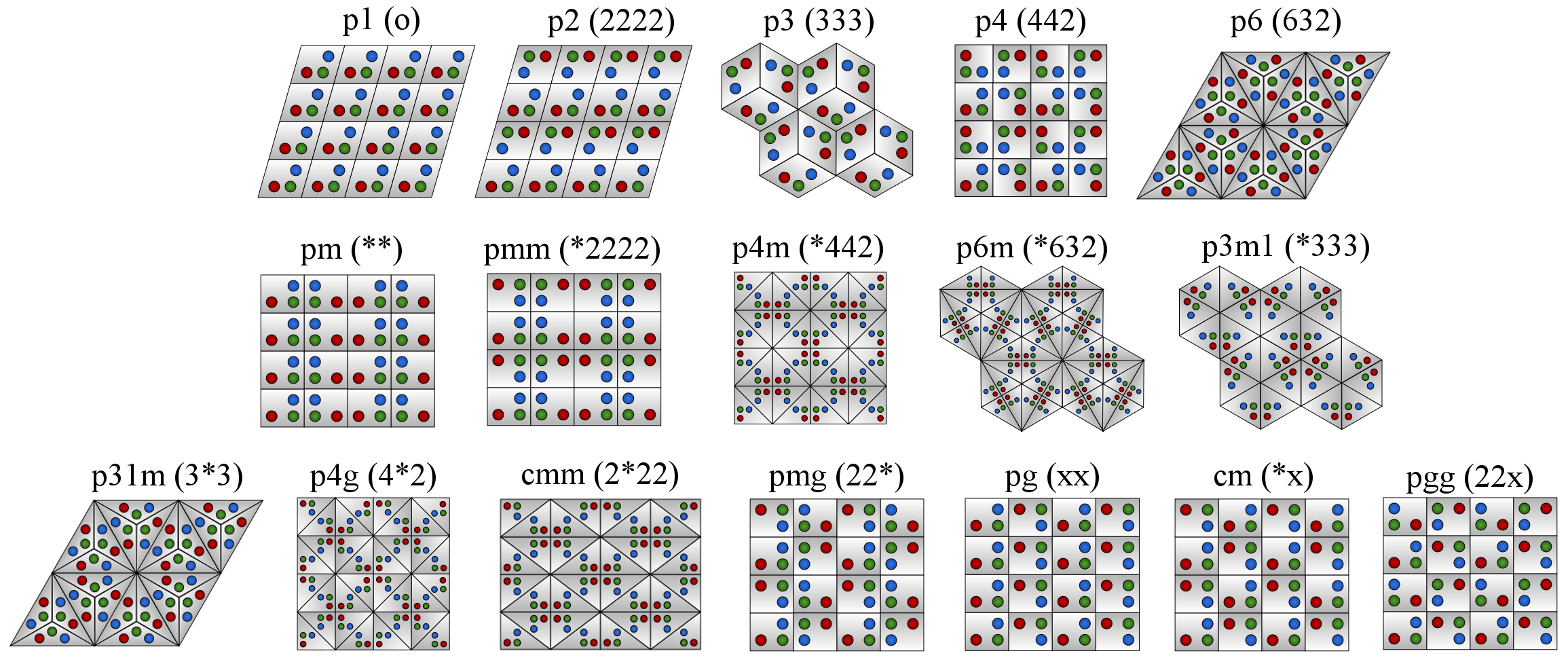 Figure 1: All symmetry groups in two dimensions with their fundamental domains outlined in black.