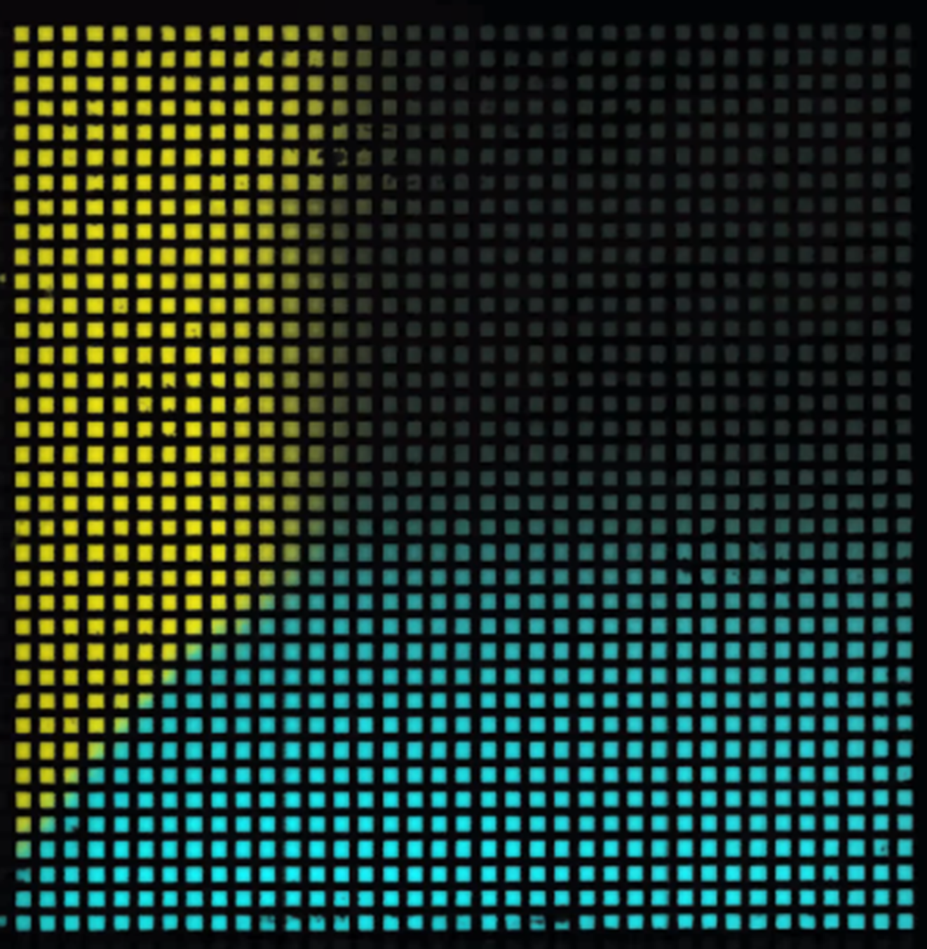 In our recently published paper in Nature Communications, the mechanism we have chosen to investigate using this technique is mutual inhibition downstream of morphogen induction. This network motif has been observed in multiple developmental contexts and has been proposed as the mechanism for creating sharp boundaries (Briscoe and Small, 2015). For our morphogens we use bacterial quorum-sensing molecules and our synthetic developmental system is composed of E. coli colonies growing on grids printed with hydrophobic ink on filter paper (Grant et al., 2016). Building this mutual inhibition circuit required many iterations of the design-build-test-learn cycle, mainly concerned with tuning the expression level and degradation of the repressors. Once we got the balance right, we saw this: