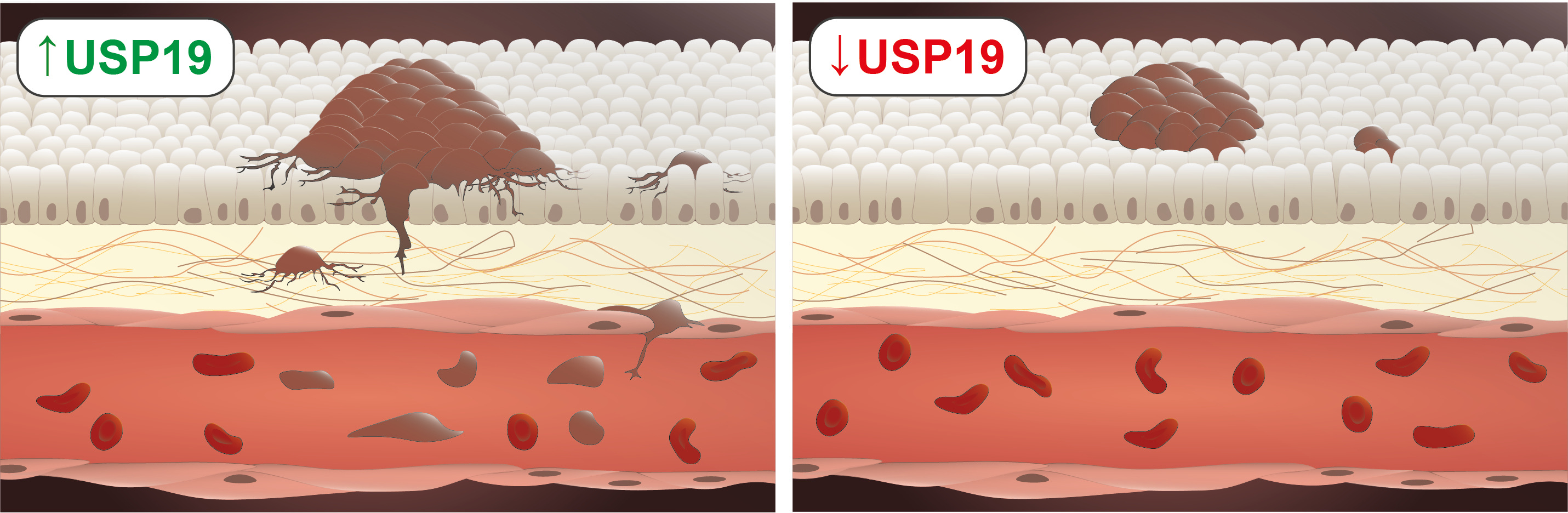 Firstly, we performed a series of in vitro experiments which showed that manipulating USP19 expression affected migration, invasion, growth in three dimensions, but not proliferation in two dimensions. These results were even more pronounced when we performed in vivo experiments: USP19 downregulation reduced tumorigenicity and tumor growth, as well as lungs colonization, and its sole overexpression induced tumor growth in cells which do not usually form tumors unless exogenously stimulated. Using an in silico approach, we realized that USP19 expression was correlated with the activation of the Wnt pathway. Therefore, we studied an already-known substrate of USP19, LRP6 (a Wnt pathway co-receptor), and demonstrated that USP19 mechanism of action in the regulation of migration involved this latter.