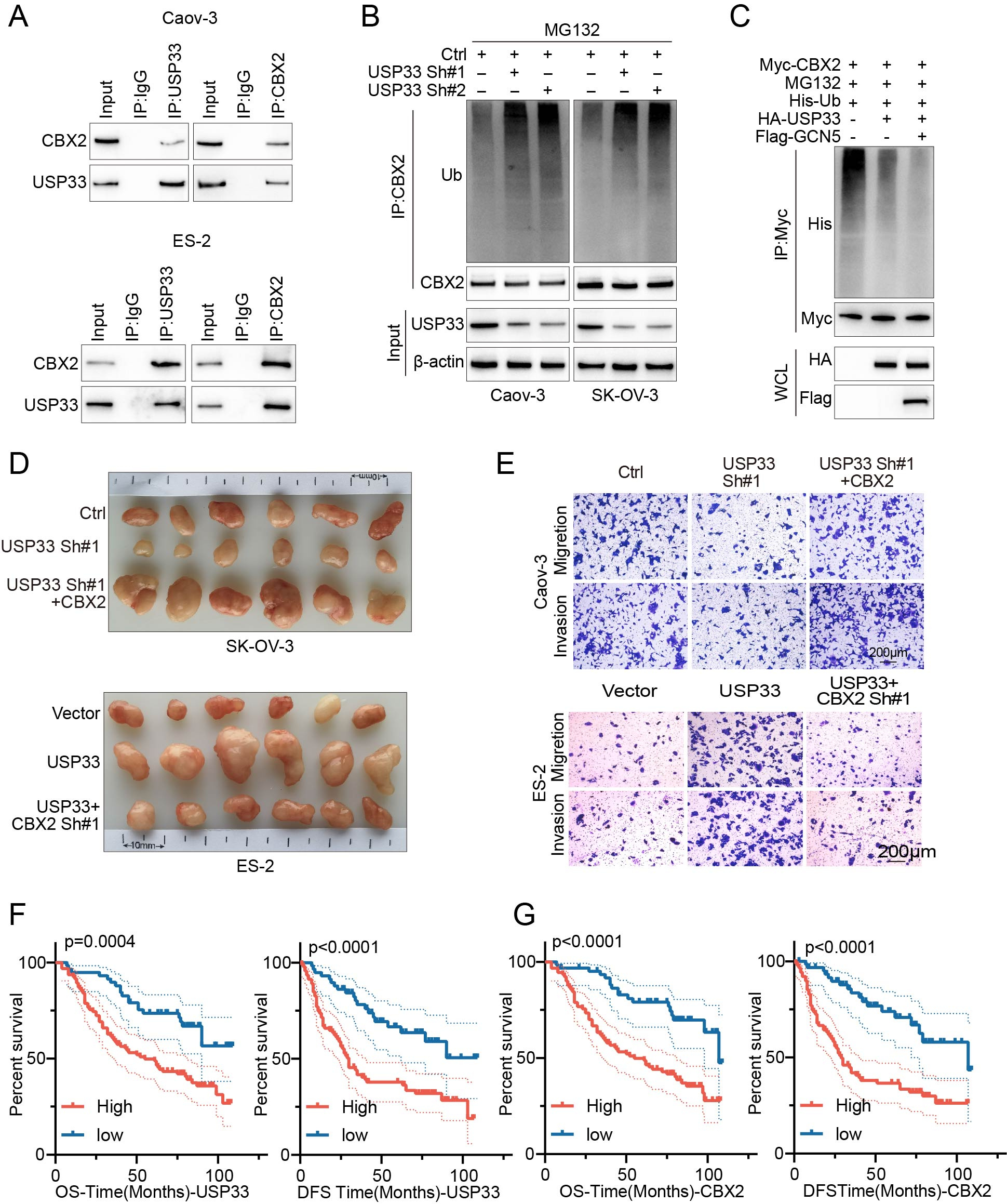This study’s innovation lies in its comprehensive elucidation of the molecular mechanisms by which USP33 promotes tumor progression through post-translational modifications, thereby providing a significant theoretical basis for future translational applications. However, several avenues for further research remain. Firstly, PhosphoSitePlus® PTM data have identified phosphorylation as another prevalent post-translational modification for CBX2. Substantial evidence suggests that the interplay between phosphorylation and ubiquitination often augments protein stability and interactions. Whether the synergy between these modifications influences CBX2 stabilization in ovarian cancer warrants further investigation. Secondly, although the oncogenic role of USP33 in ovarian cancer has been elucidated, the precise mechanisms underlying its overexpression remain unclear, necessitating further inquiry. Thirdly, it is crucial to explore the downstream targets or pathways activated as a result of CBX2 stabilization. Finally, the development of a safe and effective USP33 inhibitor is of paramount importance for assessing its potential as a therapeutic target.