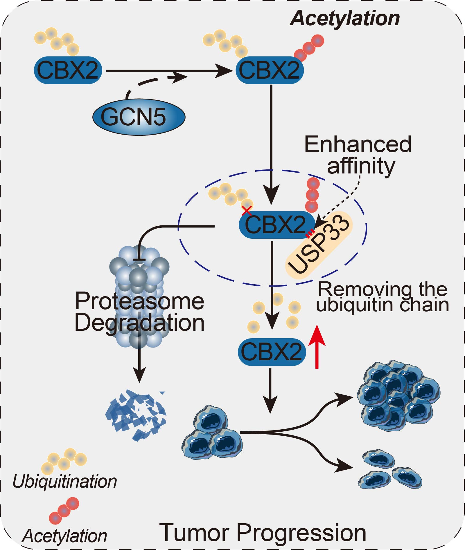 First, we employed proteomics and ubiquitinomics approaches to screen for novel substrate proteins directly regulated by USP33. Through a series of experiments, we confirmed the interaction between USP33 and CBX2. We also observed that the USP domain of USP33 and the CBX2-D2 domain are essential for their interaction. Our findings further elucidate that USP33 facilitates the deubiquitination and subsequent stabilization of CBX2. Additionally, we identified lysine 199 (K199) of CBX2 as a highly conserved acetylation site across multiple species, as indicated by data from the PhosphoSitePlus® PTM database. We then investigated whether CBX2 could be acetylated at K199 and whether this acetylation affects USP33-mediated CBX2 ubiquitination. We demonstrated that the acetylation of CBX2 at lysine 199, catalyzed by the lysine acetyltransferase GCN5, enhances its association with USP33, thereby promoting further deubiquitination and stabilization.