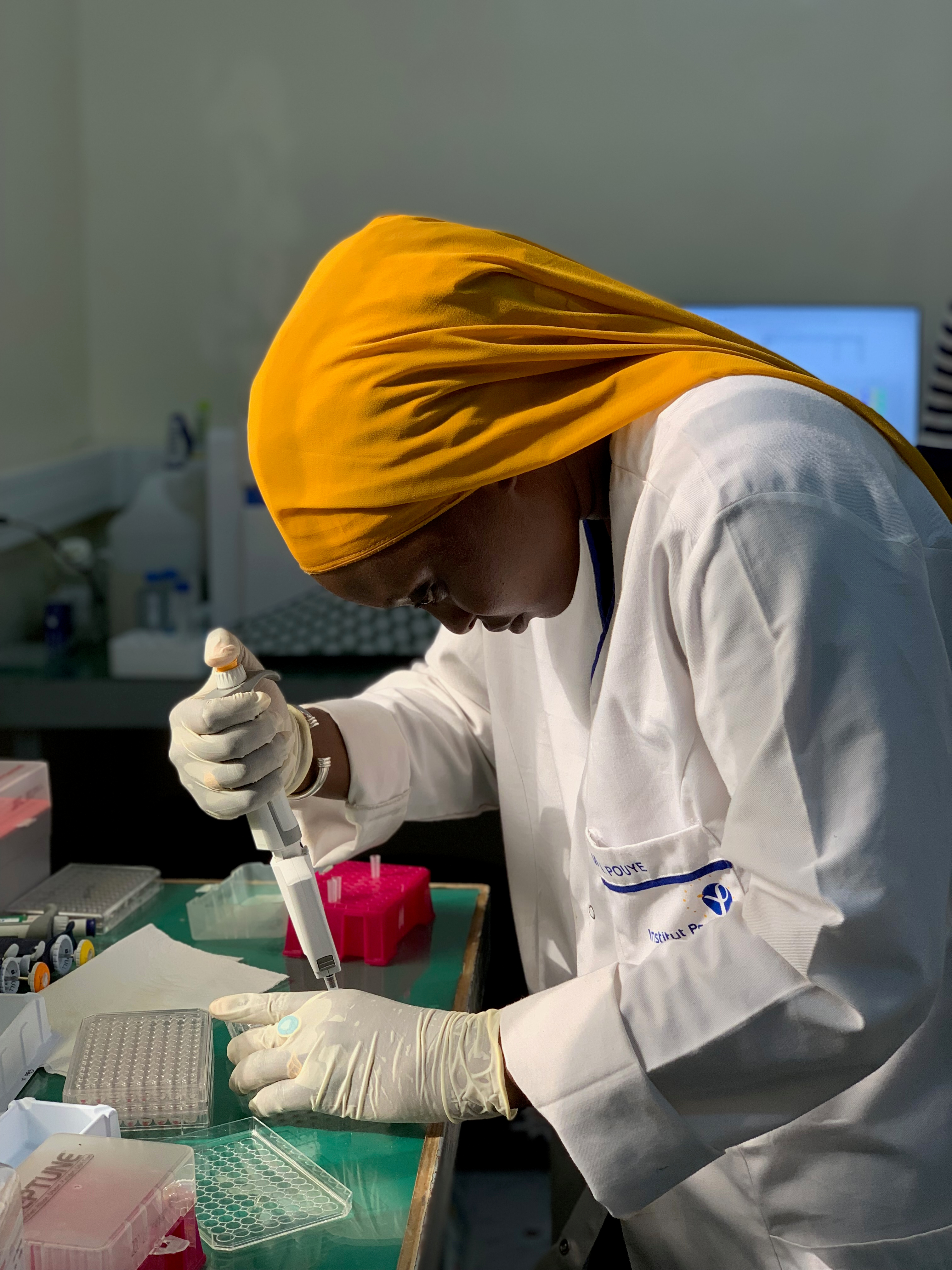 Laty Gaye Thiam mettant en place des tests GIA ex vivo. Combinaison des parasites avec les anticorps des vaccinés des essais cliniques de phase 1 PfRH5. Ces expériences nous permettent de tester l'activité des anticorps contre les parasites les plus divers et les plus complexes - en les mettant vraiment à l'épreuve !