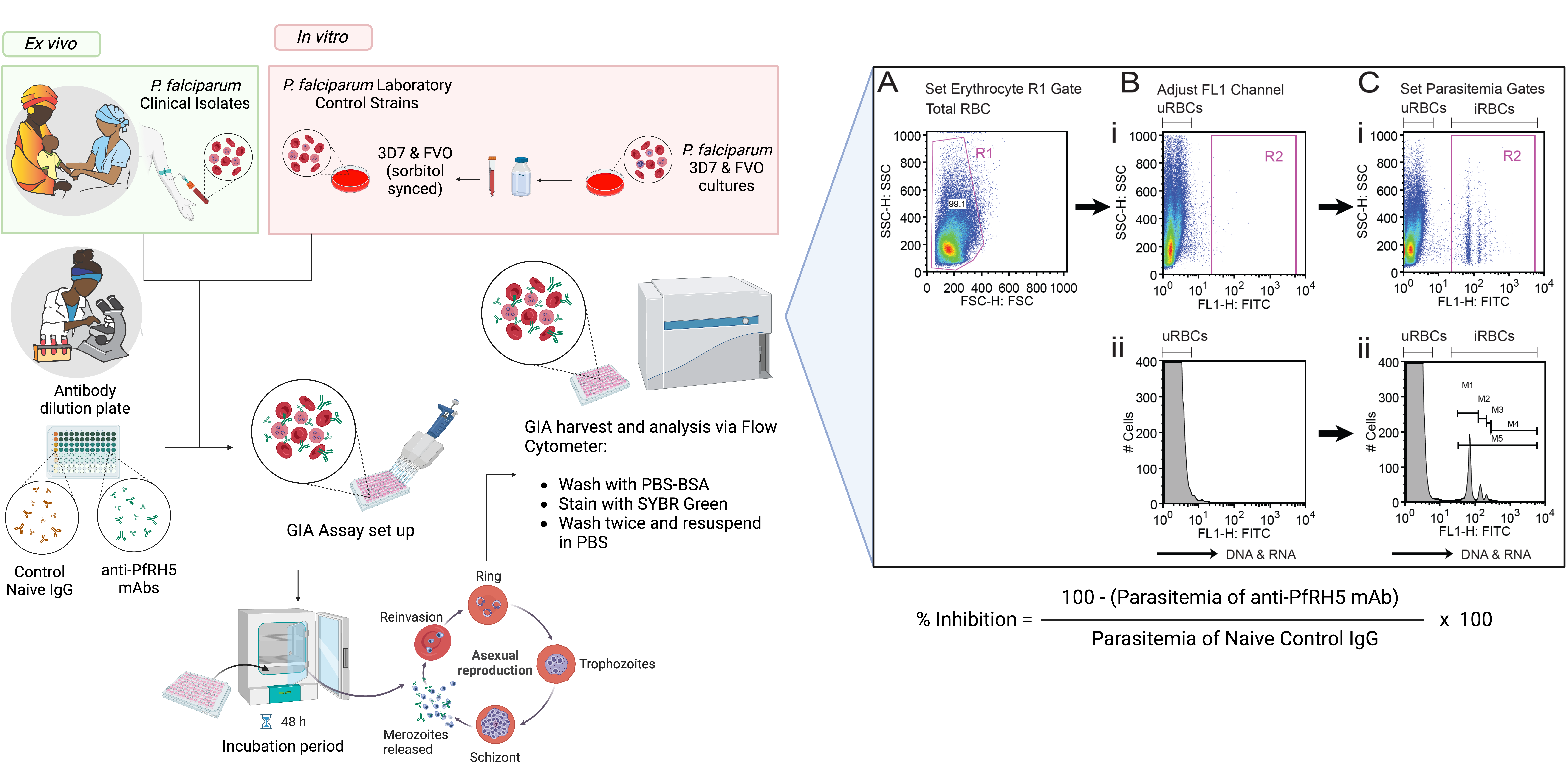 Test de l'activité des anticorps anti-PfRH5 contre des isolats cliniques sur le terrain. Créé partiellement avec BioRender.com. Crédit de la figure : Noemi Guerra, Crédit artistique : Alyssa Agarwal