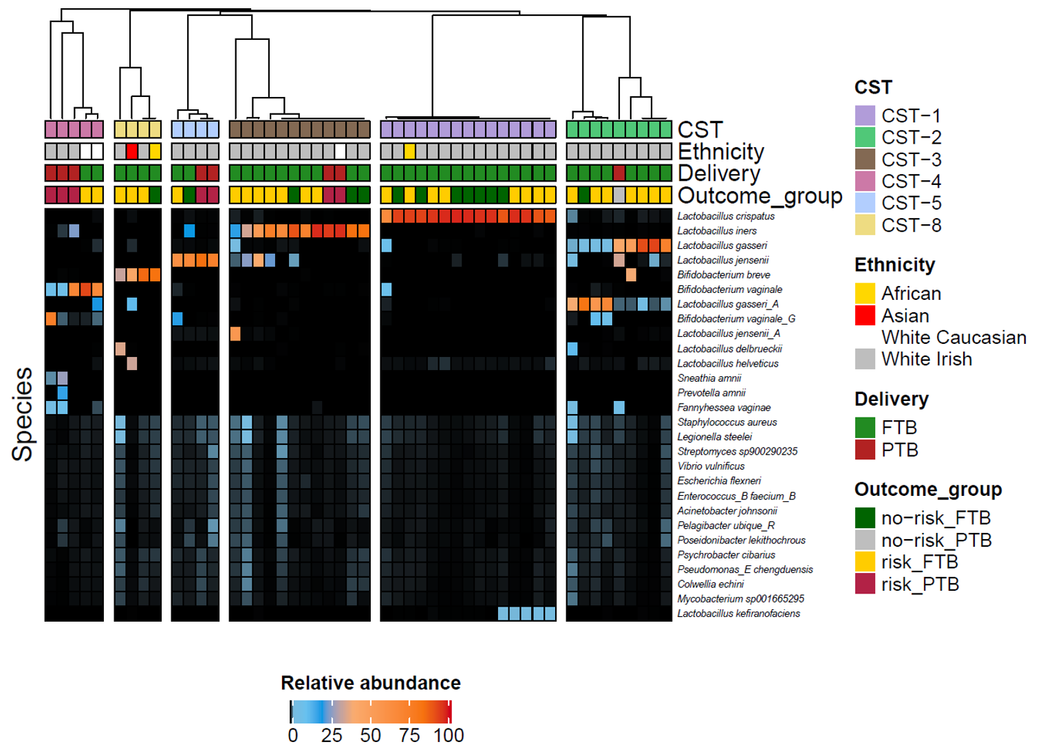 Heatmap profile of the vaginal microbiome. In this figure, each sample is shown as a vertical column. If a bacterial species is present in the sample then it will show up as a colour from blue to orange. Bacteria at high numbers have a stronger shade of orange, bacteria at low numbers have a cooler shade of blue. We found that the microbiomes can be grouped into 6 different community types, as determined by the most dominant species present. These community state types (CST) are indicated by the coloured bar across the top of the image. Full-term birth samples are shortened to FTB and preterm birth samples are shortened to PTB.