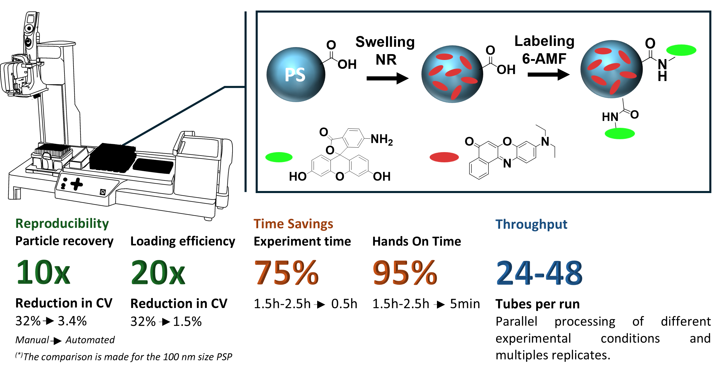 The results of our automated fluorescent PSP preparation workflows are striking. The variation of the particle recovery rate was reduced tenfold from 32% (manual) to just 3.4%. The dye loading efficiency, reached 66% ± 2% using automation, compared to 32% ± 12% for the manual approach. Equally compelling was the time saving and the reduced hands-on-time. The automated pipetting steps for the loading of NR into the PSP were completed in less than 30 minutes compared to 1.5 to 2.5 hours for the manually performed steps even by well trained staff.