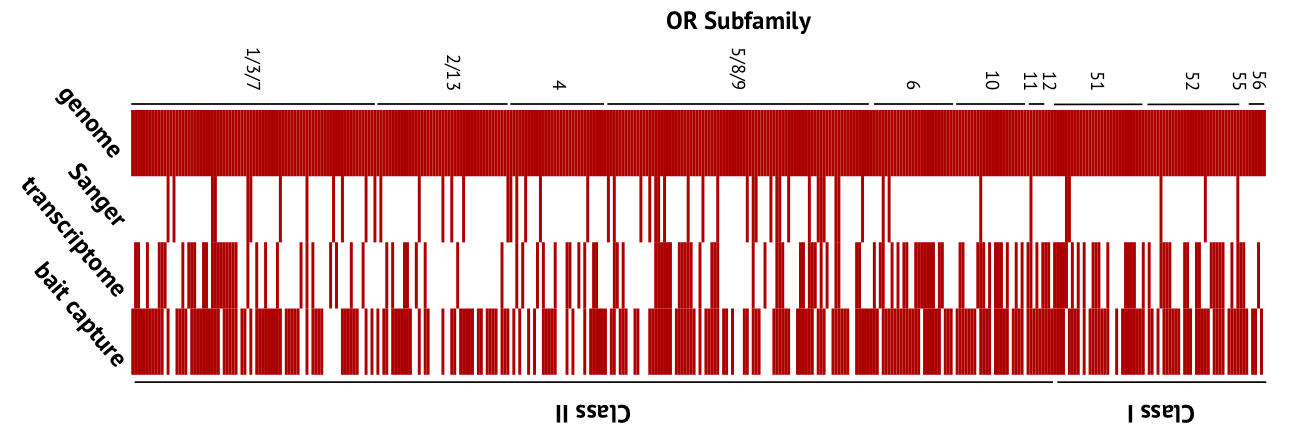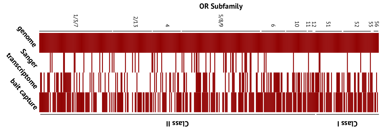 Olfactory receptor genes recovered from each method compared to genome sequences. Each row indicates a single olfactory gene identified in the genome (red = present, white = not found).
