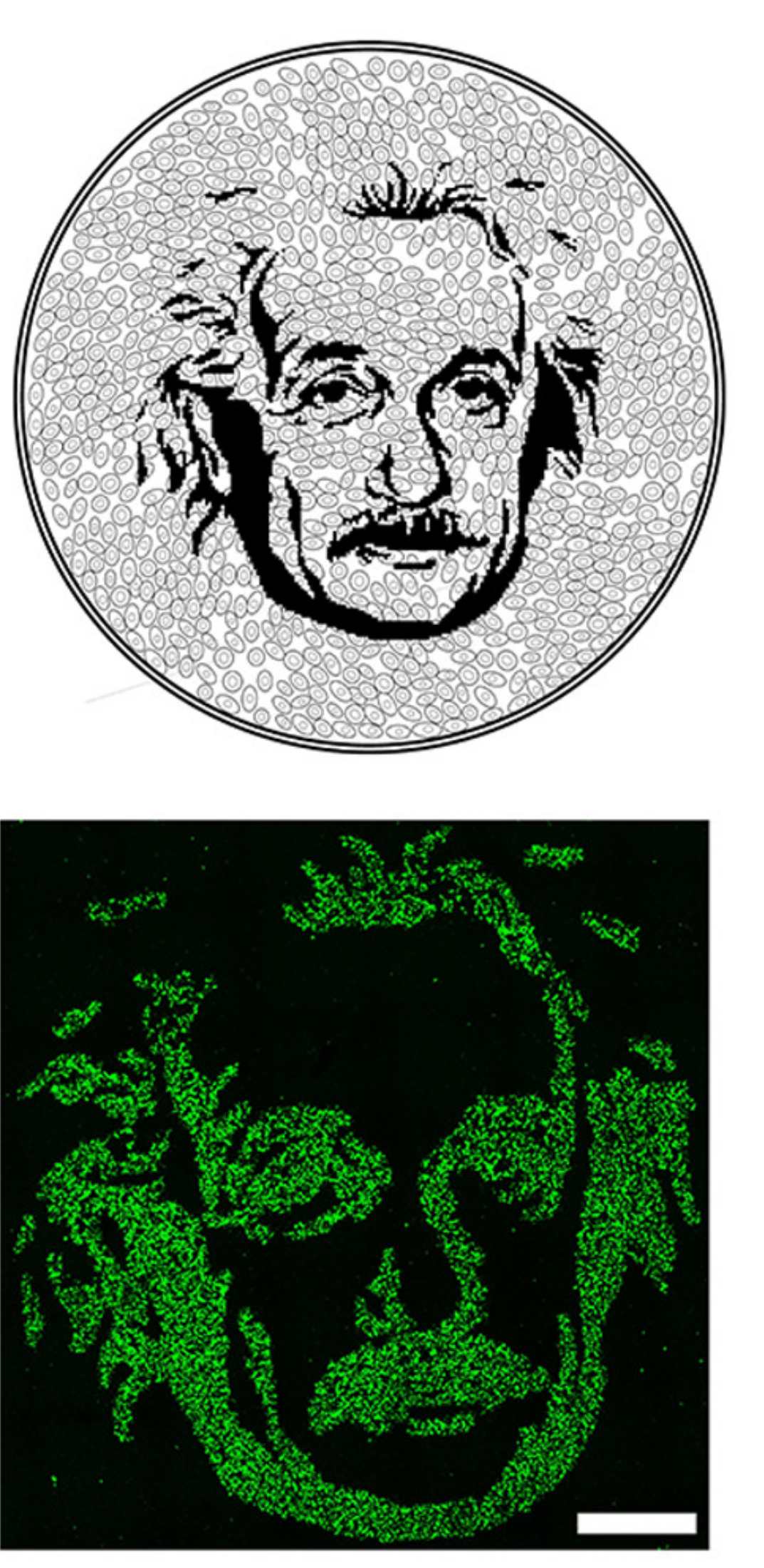 The story began 6 years ago, when we started using laser-induced vapour nanobubbles (VNB) to temporarily permeabilize the cell membrane of mammalian cells for the intracellular delivery of all kinds of exogenous molecules 1,2. In this technique, gold nanoparticles (AuNP) were deposited on the cell membrane of living cells, and after pulsed laser irradiation, nanosized pores were created in the membrane by the physical force exerted by VNB emerging from the photothermally heated AuNP. Macromolecules, such as nucleic acids or proteins, in the surrounding cell medium could be introduced into living cells without noticeable toxicity. It did not take long to realize that the photoporation technique could deliver exogenous compounds in selected subpopulations of cells, even down to the single cell level 3,4. The spatio-controlled feature of this technique can be appreciated in Figure 1, where HeLa cells were photoporated with FITC-dextran (10 kDa) in such a way that fluorophores were only delivered into those cells corresponding to the drawing of Albert Einstein.