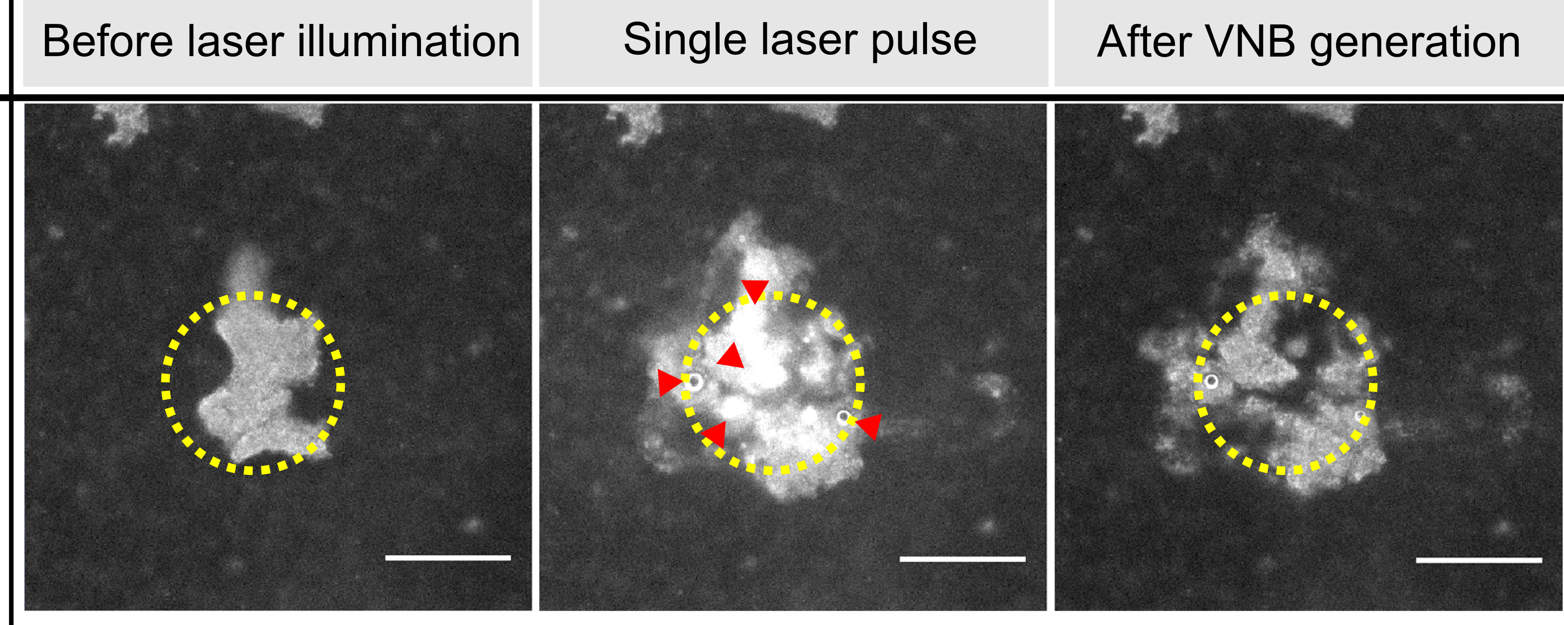 At the same time we were also working to improve drug delivery to biofilms, mostly by nanomedicines, as a way to enhance drug penetration deep into dense biofilms. After finding out that nanoparticles below 0.1 µm are small enough to penetrate into dense biofilms 5, soon the idea arose that it could be possible to administer AuNP to biofilms and interfere with the biofilm structural integrity by the physical force exerted by laser-induced VNB. Due to the fine precise control of laser light, and the localized action of VNB, the technique would be highly spatio-controlled and, therefore, would have the potential to be applied to specific infected areas in the body. First proof-of-concept experiments were carried out on the gram-negative bacterium Burkholderia multivorans. Dark-field microscopy images showed that the localized shockwaves induced by VNB could subtly but significantly expand the space between sessile cells, which resulted in 80 times improvement of the efficacy of the antibiotic tobramycin.