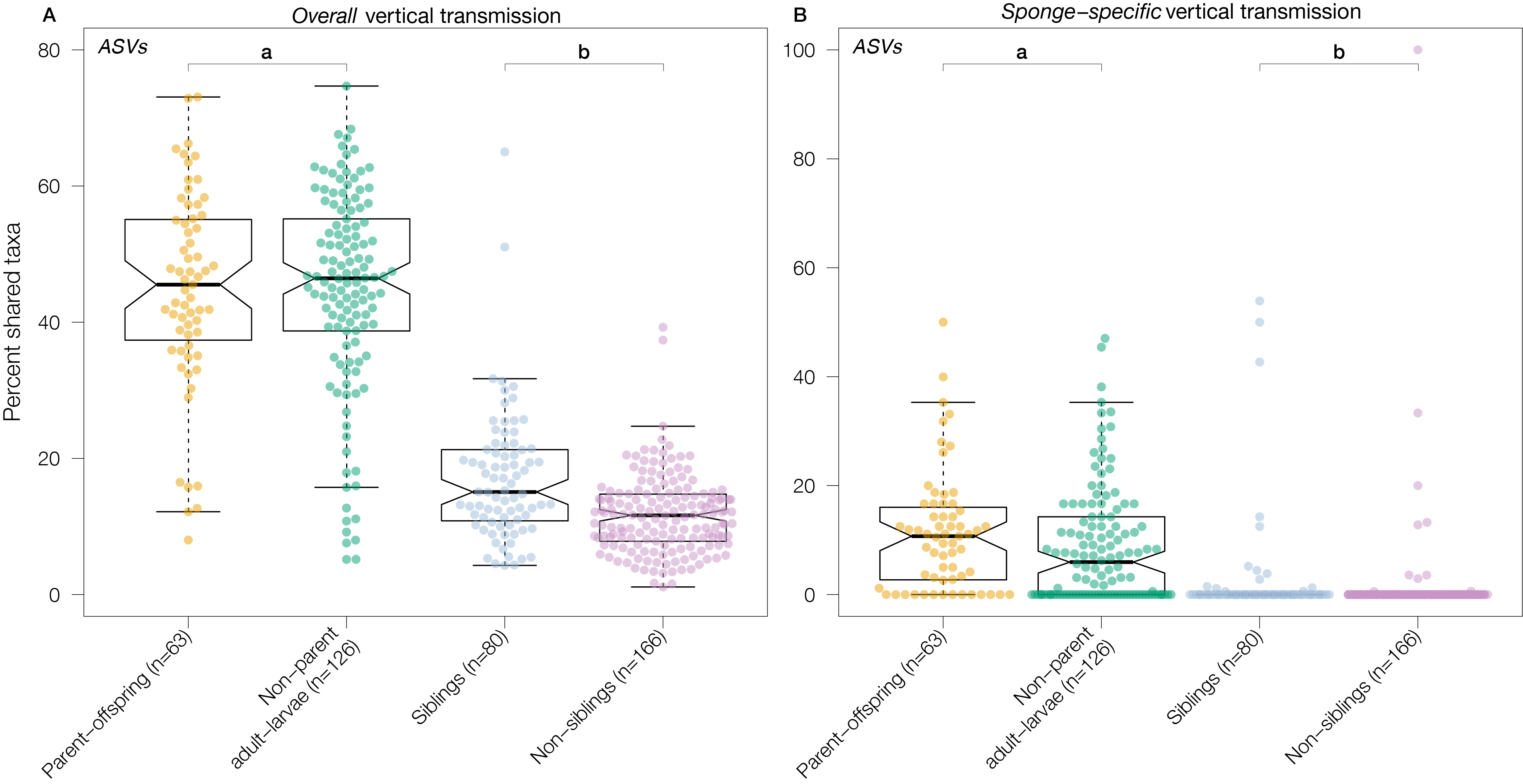 Across eight sponge species, we show that: (1) vertical transmission is relatively comprehensive, but often undetectable. While larval sponges shared, on average, 44.8% of microbes with their parents, this fraction was not higher than the fraction they shared with nearby conspecific adults who were not their parents; (2) vertical transmission is inconsistent across siblings, as larval sponges from the same parent only shared 17% of microbes, and (3) vertically transmitted microbes are not faithful to a single sponge species: surprisingly, larvae were just as likely to share vertically transmitted microbes with larvae from other species