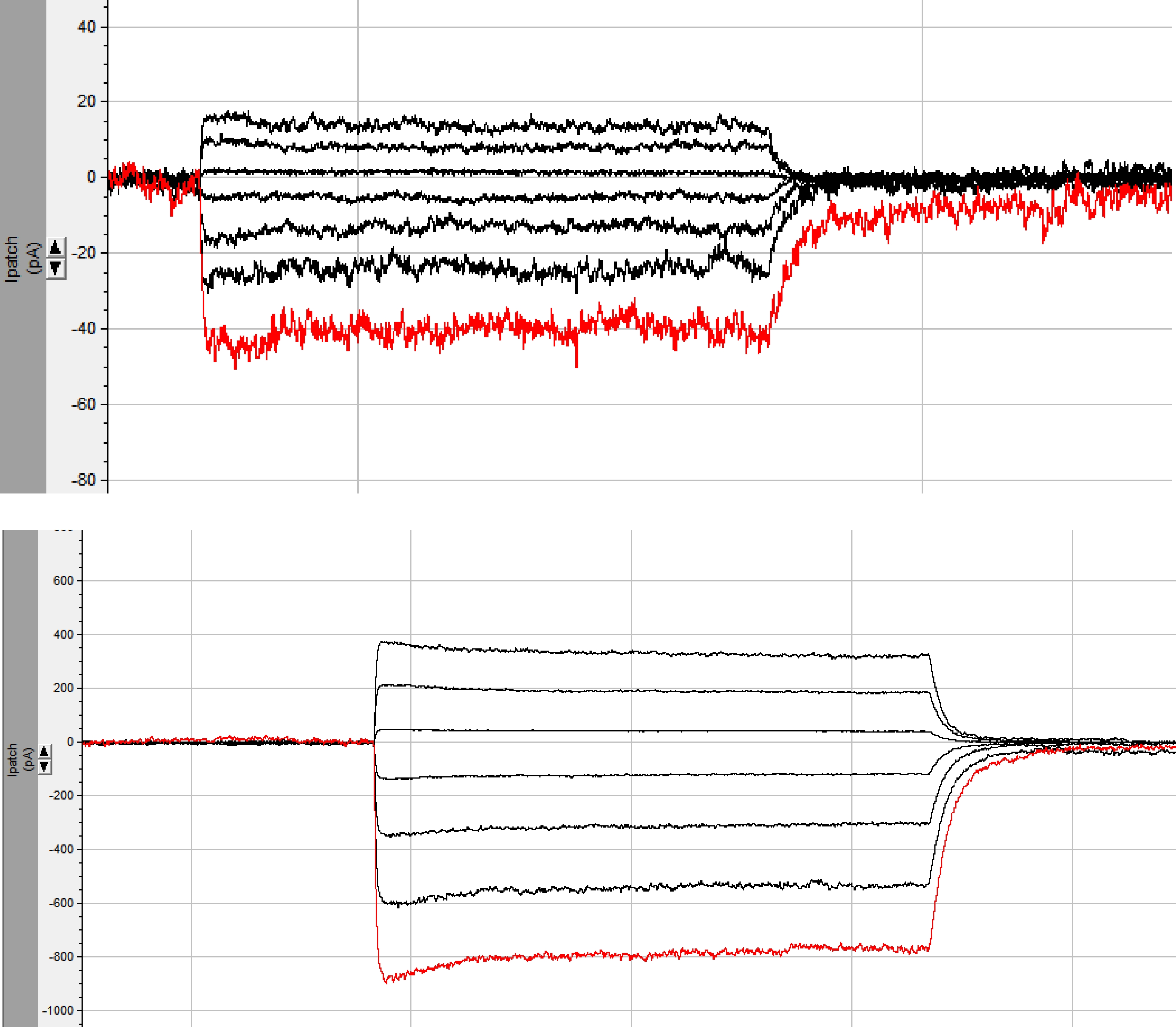 Screenshots of the initial raw photocurrents measured for one of the viral channelrhodopsins (pictured exactly two years ago). Top: measurement after addition of a chimeric N-terminus from ChR2/ChR1; Bottom: measurement after additional truncation of the C-terminus, leading to 20-fold increase of photocurrent amplitudes (compare different scales; photo credit: Jonas Wietek)