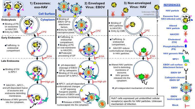 Figure 1. Comparison of cell entry mechanisms by endocytosis of exosomes, enveloped EBOV particles, and non-enveloped HAV particles.Schematic representation of models leading to the release of viral genomes into the cytoplasm. 1) Cargo delivery of exosomes from HAV-infected cells (left panel). Exosomes attach to HAVCR1 at the cell surface, enter the cell by clathrin-mediated endocytosis (CME), traffic from the early endosome (EE) to the late endosome (LE). Cholesterol (Chl) on the exosome membrane binds to NPC1 on the LE membrane resulting in membrane fusion and release of the capsid-free HAV genomic RNA into the cytoplasm. Chlorpromazine (CPZ) that blocks CME, 4-bromobenzaldehyde N-(2,6-dimethylphenyl)semi-carbazone (EGA) that blocks EE to LE transport, and inhibitors of low pH prevented exosome cargo delivery and HAV infection. 2) EBOV infection (middle panel). EBOV enters the cell by CME or macropinocytosis, binds to attachment factors at the cell surface, reaches the EE where HAVCR1 binds to phosphatidylserine(PS) on the viral membrane. Proteases begin to cleave GP, and viral particles traffic from the EE to the LE where cathepsin cleavage GP exposing the NPC1 binding region. Binding of NPC1 to the cleaved GP under low pH triggers conformational changes in GP resulting in the extrusion of the fusogenic peptide, fusion of the delimiting membranes of the virus and LE, and release of the nucleocapsid into the cytoplasm. 3) HAV particle infection (right panel). HAV particles bind to HAVCR1 at the cell surface, enter the cell by CME and are transported to the EE where they bind to more HAVCR1 and undergo conformational changes. The altered HAV capsids bind to the delimiting membrane of the LE, and the HAV genomic RNA is released into the cytoplasm. In contrast to 1 and 2, this process does not require membrane fusion and low pH. Because knockout of HAVCR1 in Huh7 cells blocks cell entry of exosomes from HAV infected cells but not HAV particles, we concluded that these cells express a yet unidentified cellular receptor specific for HAV particles. The cell entry mechanism of HAV particles using this unidentified cellular receptor is unknown and will require further investigation.