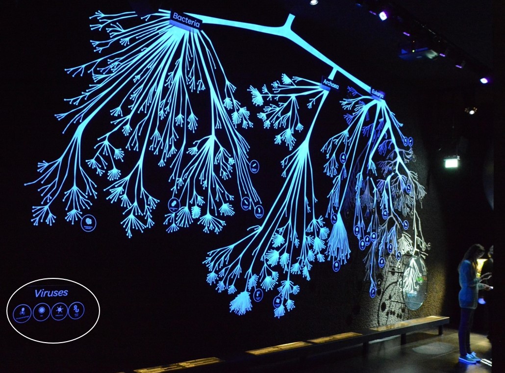 The ART paper, which was written by senior representatives of the International Committee on Taxonomy of Viruses (ICTV), the overseer of all matters of virus taxonomy, describes the introduction of a new rank structure of virus classification that was expanded to closely resemble a Linnean taxonomy, as used elsewhere in biology. To appreciate the scale of this development, which may be “revolutionary” to some, just look at a prevailing perception of virus diversity depicted at the otherwise fascinating Micropia Museum in Amsterdam (Figure 1): four small “virus” icons sitting next to each other in the left corner and next, to the right, a large Tree of Life (ToL) detailing evolutionary relationships of cellular life forms, from microbes to humans. While some may not agree with the accompanying text saying viruses are not life forms, few will challenge the depiction per se.