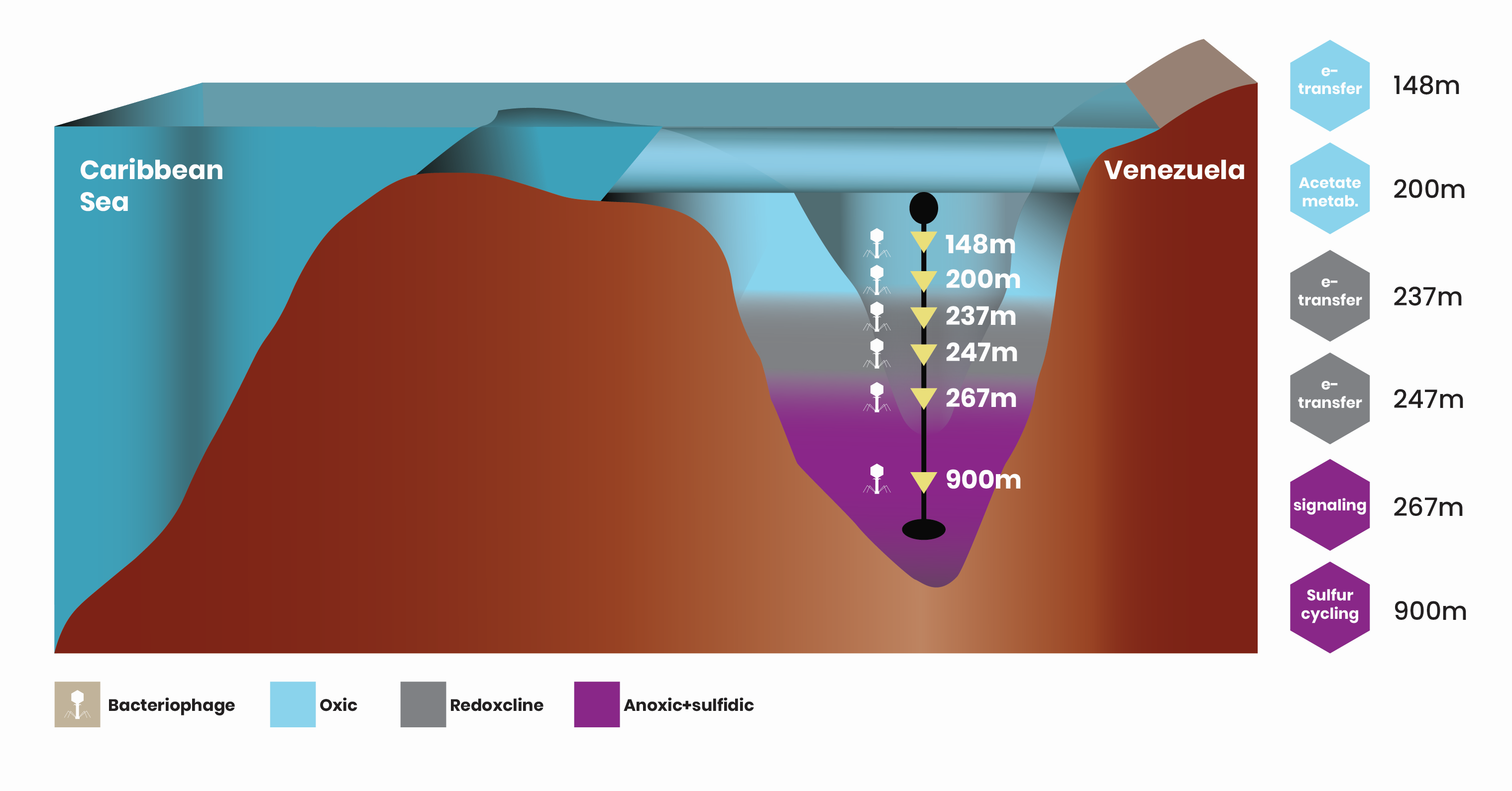 Figure 1. Virus-encoded AMGs along the water column in the Cariaco Basin. AMGs implicated in described pathways at each depth are shown to the right in hexagons representing bacteriophage heads. Blue are from oxic water depths, grey indicate redoxcline depths, and purple anoxic and sulfidic depths of the basin.
