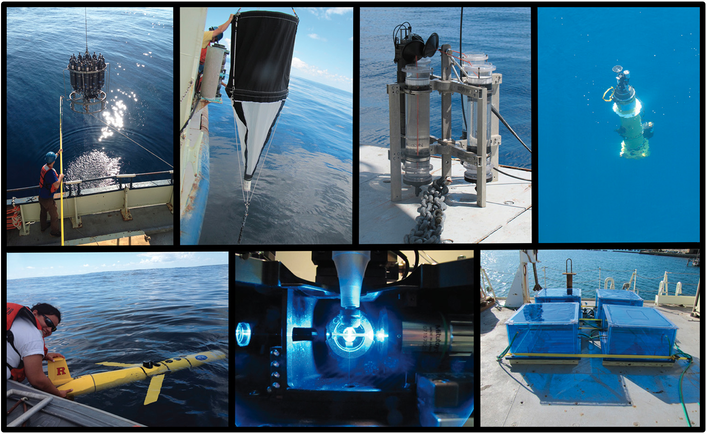 An intriguing chapter in this arms race story was started when PIs Kay Bidle, Ben Van Mooy, Assaf Vardi, Jack DiTullio and Marco Coolen wondered if EhV infection can lubricate the vertical fluxes of carbon by pumping it into the ocean interior. Their hypothesis was based on previously observations that EhV infection enhances the production of glue-like polysaccharides called TEP, which serve to entrap cells, debris, and surrounding particles in larger aggregates. Combined with ballasting provided by dense coccoliths (biominerals that surround E. huxleyi cells), these particle aggregates could readily sink out of the surface layers to depth and, in turn, perhaps counter the assumed impact of ocean microbe viral infection: recycling carbon in the surface ocean. Having developed novel, lipid-based biomarkers that allowed the diagnosis of active infection in natural phytoplankton communities for the first time, the stage was set for this collaborative team to interrogate the impacts of viruses on upper ocean carbon biogeochemistry.