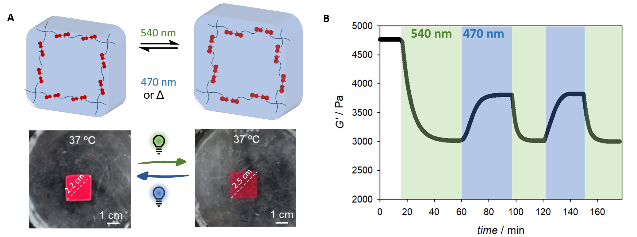 Figure 1. (A) Representative scheme of photoswitching of the inserted thioindigo isomers with different dipole moments within hydrogel structure (top), and images of GelT5 in water at 37 ºC following green (λmax = 540 nm) or blue (λmax = 470 nm) LED light irradiation for 30 min, displaying expansion and contraction. (B) Rheological data of the photoswitching of thioindigo-containing hydrogel under alternating green and blue light irradiations.