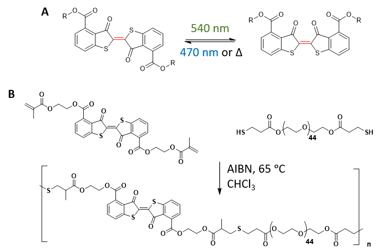 Scheme 1. (A) Thioindigo moieties undergo reversible photoisomerization enabled by green and blue light, leading to a spatial conformational change of the attached molecular payload by a 180º rotation around the C=C bond. (B) A thioindigo bismethacrylate that can undergo free-radical thiol-ene polymerisation with a PEG-dithiol forming step-growth polymer with thioindigo moiety incorporated in the polymer backbone.
