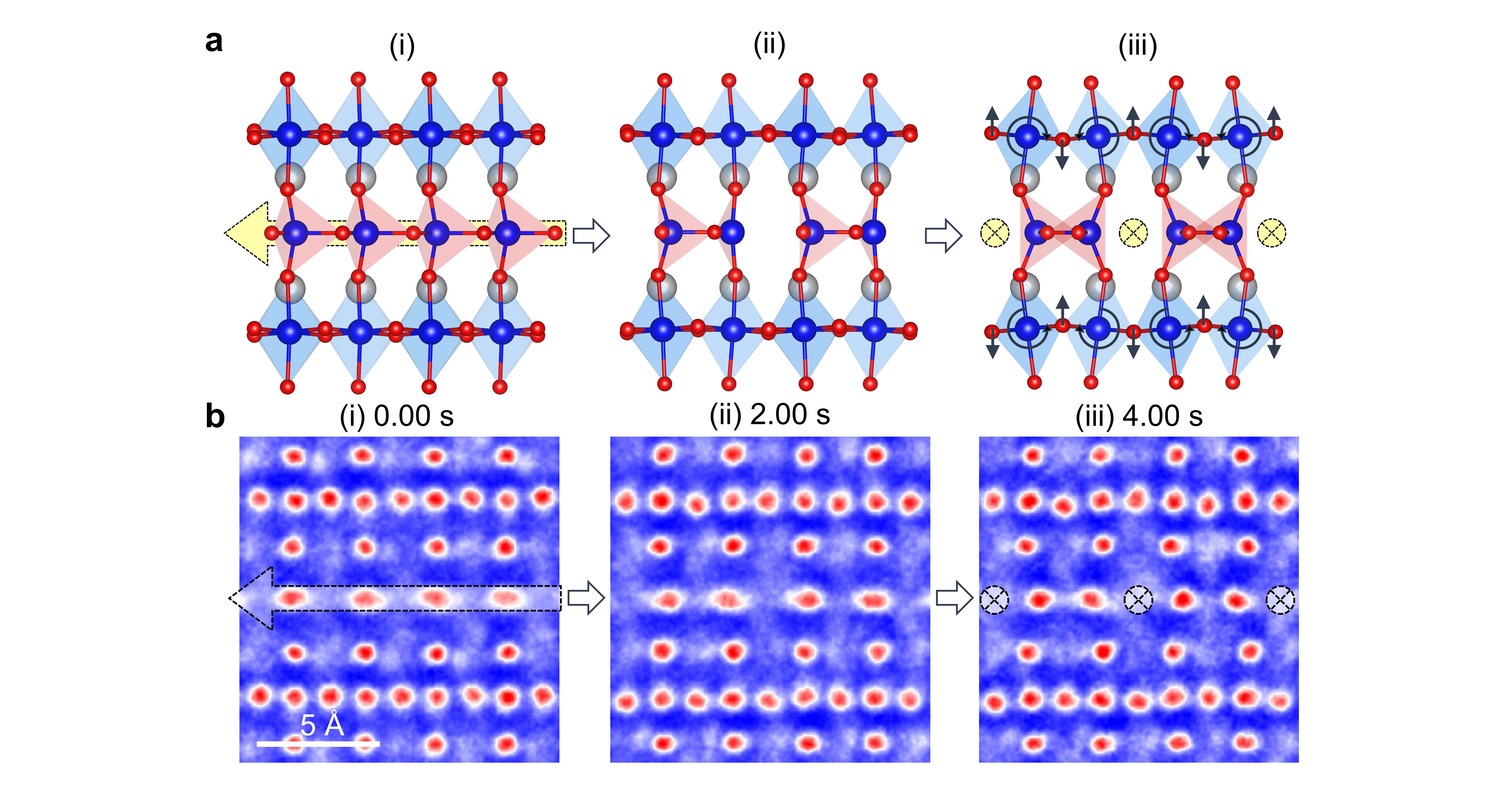 This investigation stemmed from a fundamental question: how does a three-dimensional (3-D) transition metal - oxygen polyhedra (octahedra and tetrahedra) transform into a two-dimensional (2-D) square planar configuration microscopically? Typically, cations strive to coordinate themselves symmetrically with the greatest number of bonds rather than adopting a planar arrangement. A creative and simple ball-and-stick model was suggested to provide insight into the underlying kinetic diffusion pathways of this intriguing transition, manipulating oxygen atoms like playing with Lego blocks3. However, since then, there had been no experimental evidence for the microscopic rearrangements of the ions.
