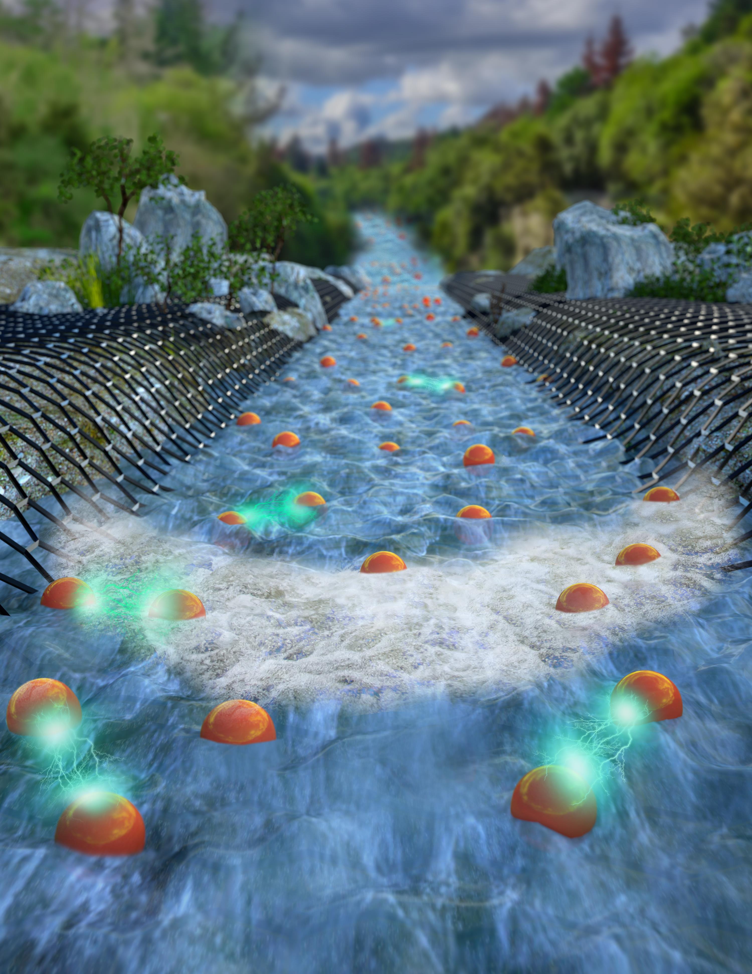 Figure 1. Artist's conception of electron hydrodynamics, illustrated as a river of electrons flowing in graphene. The viscosity generated by the repulsion between electrons (red balls) causes them to flow with a parabolic current density, depicted by the white foam wavefront.