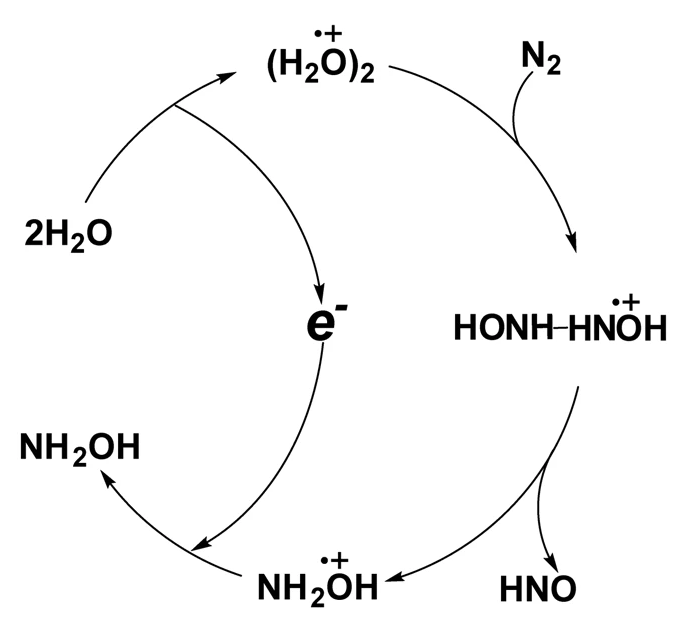 Having completed this work, we now look at WDRACs as heaven-sent for N2 fixation. Several factors fall into place quite serendipitously: the symmetry and relative stability of [H2O•••OH2]+• configuration, the excellent stability of excited-state nitrogen (N2*), and the possibility of the excited-state double proton transfer. Once all these factors matched together, a principally novel approach to green N2 fixation under mild conditions became possible. We believe that our discovery should bring about entirely new look and surprisingly appealing possibilities to the problem of nitrogen fixation on an industrial scale.