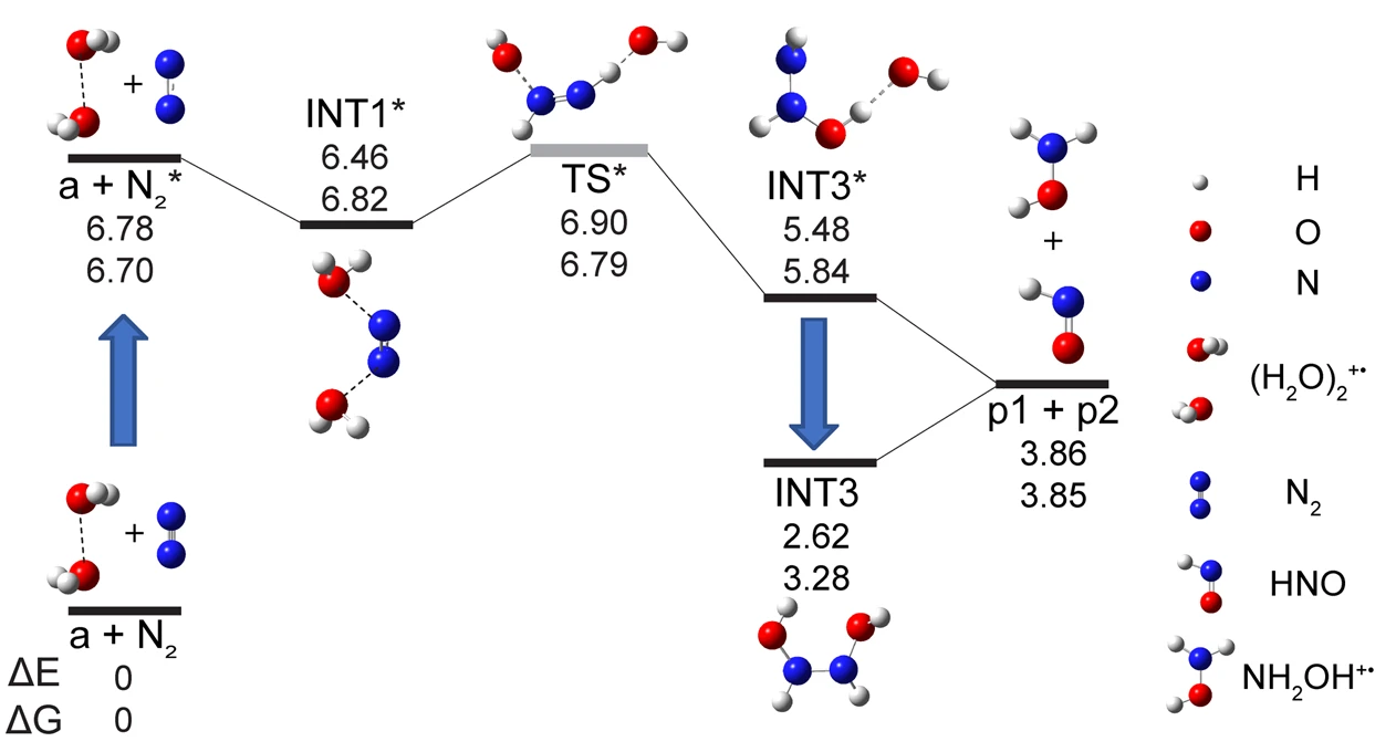 Nevertheless, even though thermodynamically allowed, the mechanism of the reaction between N2* and WDRAC still remained obscure. Earlier research and our own calculations indicate that the global energy minimum for WDRAC ion is the hydrogen-bonded [H3O+•••OH•] configuration. However, no matter how hard we tried, we could not find a stable intermediate structure for the binding of N2* with [H3O+•••OH•]. And here came our second realization: