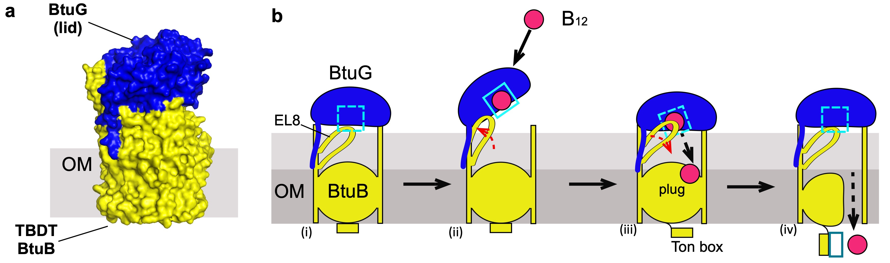 Figure 2. a, surface representation of the crystal structure of the complex BtuB (yellow)-BtuG (blue). b, proposed model of B12 uptake, (i) closed complex, EL8 occludes the binding site; (ii) the complex opens, EL8 is displaced and B12 binds BtuG; (iii) upon closing, EL8 returns to its natural position forcing the displacement of B12; (iv) B12 is translocated into the periplasm.