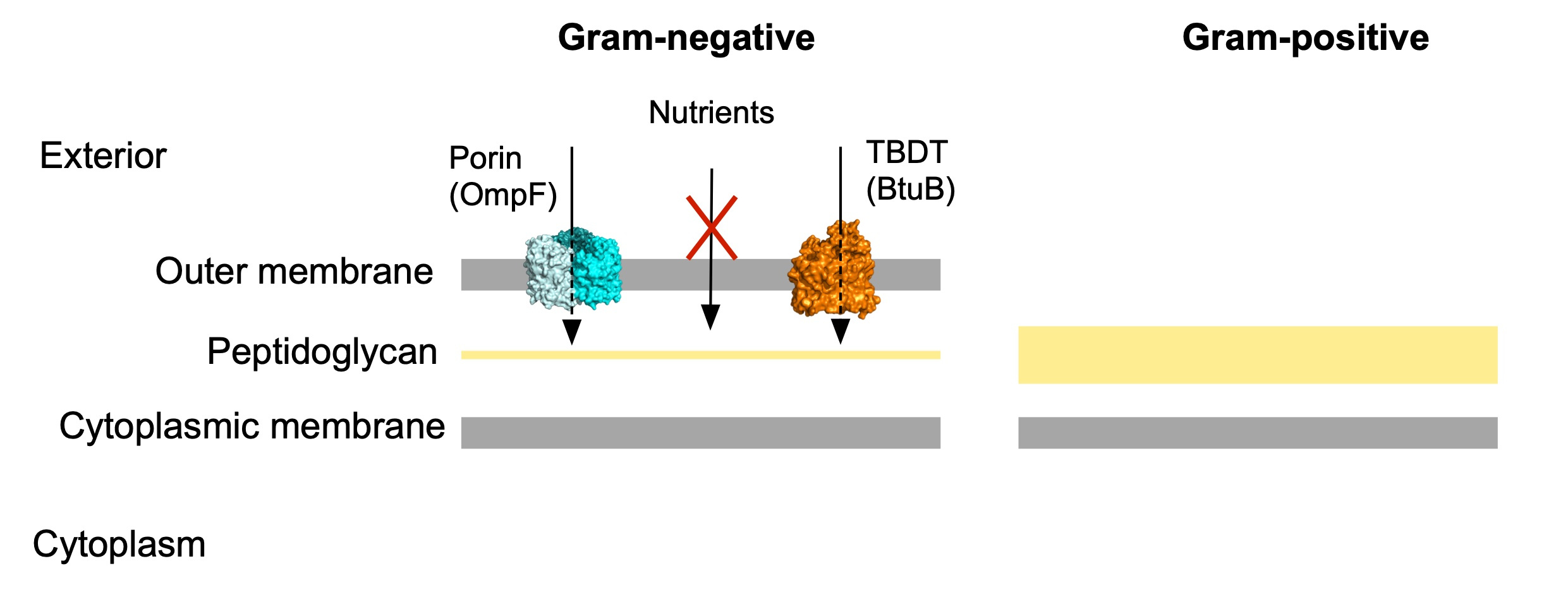 Despite of decades studying nutrient acquisition in bacteria, our knowledge is mostly derived from Proteobacteria, leaving this key process poorly characterised in other important bacterial groups. Briefly, uptake is defined as the translocation of nutrients from the external space to the cytoplasm and for this, nutrients need to cross the cell envelope. For Gram-negative bacteria this “crossing” becomes more challenging due to the presence of an extra layer in that envelope, the outer membrane (OM; Figure 1). This external feature is a terrific asset due to its intrinsic barrier function which protects the cell from noxious compounds. However, the price to pay for this protection is a more complex nutrient acquisition process. To solve this problem, Gram-negative bacteria have two classes of OM transport proteins: diffusion channels (eg. porins) and active transporters (TonB-dependent transporters, TBDTs; Figure 1). The former transport small molecules by an inwardly-directed concentration gradient, while TBDTs are active transporters that import larger molecules and utilise very low external concentrations of substrate. These scarce molecules, for example B12 or iron, play key roles in a multitude of cellular processes such as colonisation of the environment, survival and pathogenesis, and are therefore valuable to the cell. One of the best studied TBDTs is BtuB from Escherichia coli, which imports the most complex vitamin in nature, B12 (cobalamin).