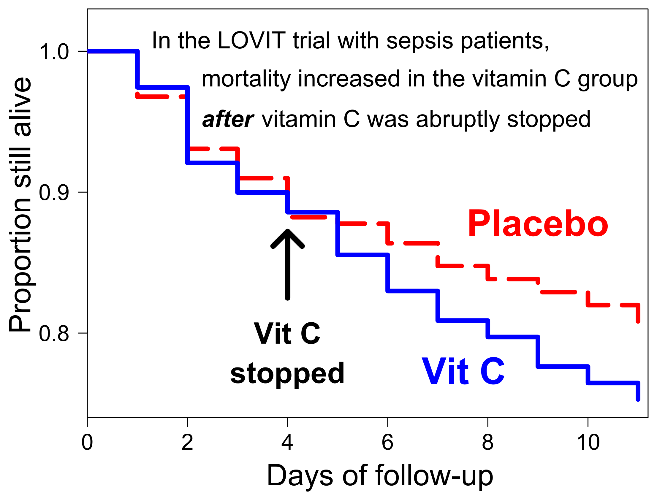 We found that there was no difference between the vitamin C and placebo groups during the 4-day vitamin C administration, indicating that vitamin C itself was not harmful. Immediately after the termination of vitamin C, on days 5 to 7, there was a 2.3-fold increase in mortality in the vitamin C group when compared to the placebo group, see Figure below. This indicates that it was the termination of vitamin C which caused the harm to the vitamin C group. Hence the conclusion of the LOVIT trial authors that the “receiving” of vitamin C explained the observed harm seems unjustified. Further research on the role of vitamin C for critically ill patients is needed and should not be discouraged by the increased mortality caused by the abrupt termination of vitamin C in the LOVIT trial.