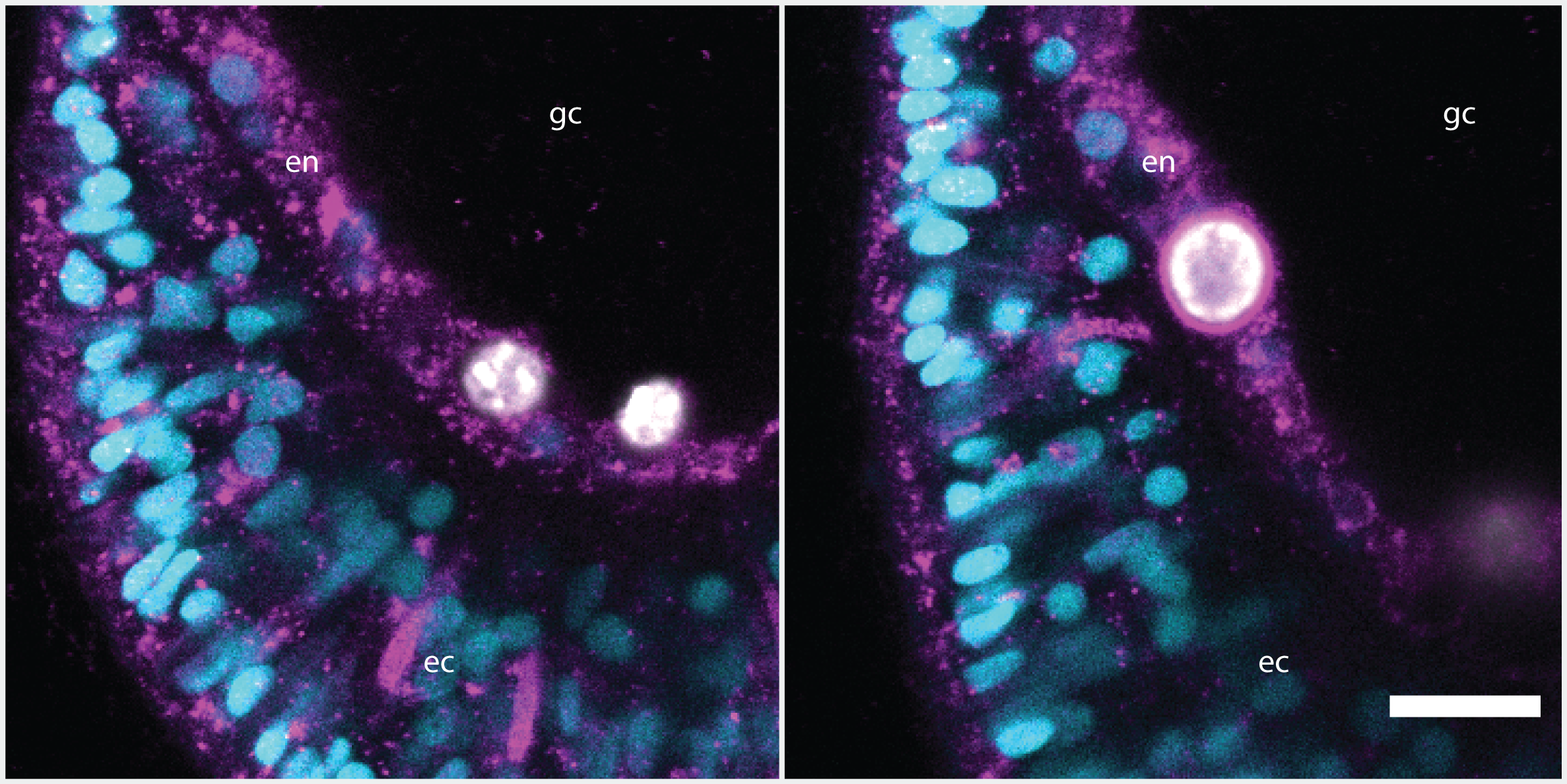 Both non-symbiotic and symbiotic microalgae are phagocytosed by the endodermal cells of Aiptasia larvae. Phagosomes containing non-symbiotic microalgae (left) do not accumulate the lysosomal membrane protein LAMP1. Symbiosomes containing symbionts (right) are decorated with LAMP1 shortly after uptake. Gastric cavity (gc), endoderm (en) , ectoderm (ec). LAMP1 (magenta), nuclei (cyan), microalgae auto-fluorescence (white). Scale bar 10 µm.