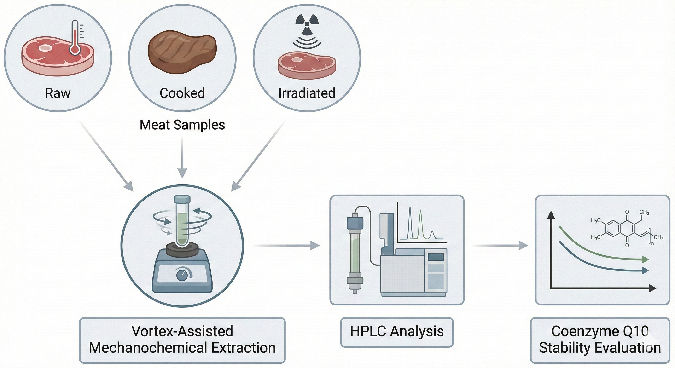 CoQ10 plays a crucial role in mitochondrial energy production and acts as an antioxidant. While it is widely studied in supplements and pharmaceutical formulations, its behavior in food matrices—especially meat—has received comparatively less analytical attention. Meat presents a challenging matrix due to its high lipid content, protein complexity, and the presence of compounds that may interfere with extraction and chromatographic analysis.