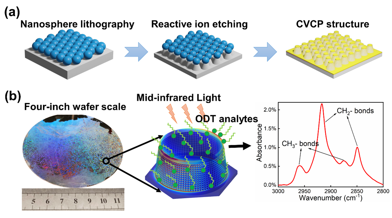 By employing nanosphere lithography to fabricate this structure, the area of the SEIRA substrate could be extended to a four-inch wafer scale with high uniformity. To demonstrate a prototype, self-assembled monolayer octadecanethiol (ODT; CH3(CH2)17SH) was chosen as the test analyte to illustrate the high efficiency of the SEIRA substrate. By adjusting the height of the structure to maximize the electric field coupling, the EF of the detected signal in the ODT reached 2.1 × 103. After extending the area of measurement to square millimeters, the SEIRA substrate enhanced the detection limit of ODT to 10nM and exhibited a detection limit four orders of magnitude lower than that of a flat gold substrate.
